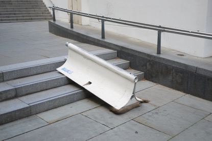 Loitering around the city, these kind of make-shift objects are always intriguing to me – just the pure form or the power relationships they hold. This one is a make-shift method for skateboarding down the stairs, installed next to a handrail designed to prohibit skateboarding.