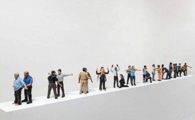 The image of the collapsing Twin Towers engulfed in flames is now an iconic image. It has played a large part in shaping the public’s perception of terrorism. This does not only stem from the catastrophe itself, but also how life has been directly affected since: the sorrow of losing the beloved, the shock of the aftermath, the fear of an uncertain future. Indian artist Jitish Kallat’s Circadian Rhyme 1 was on show in the recent group exhibition Age of Terror: Art since 9/11 at The Imperial War Museum. Kallat’s work depicts the postures that are now the language of airport security. This showcases how the control of security against risks or attacks has infiltrated daily life, affecting the scores of people at airports every day.