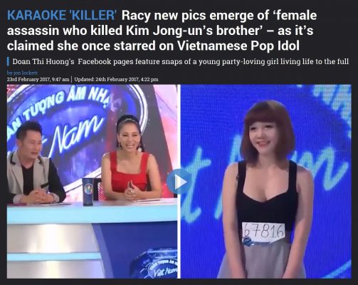 Lockett, J. (2017) ‘KARAOKE ‘KILLER’ Racy new pics emerge of ‘female assassin who killed Kim Jong-un’s brother’ – as it’s claimed she once starred on Vietnamese Pop Idol’. Available at: https://www.thesun.co.uk/ news/2934292/kim-jong-un-brother-assassination-nam-north-korea-woman-arrested-pop-idol-vietnam/ (Accessed: 16 May 2018).