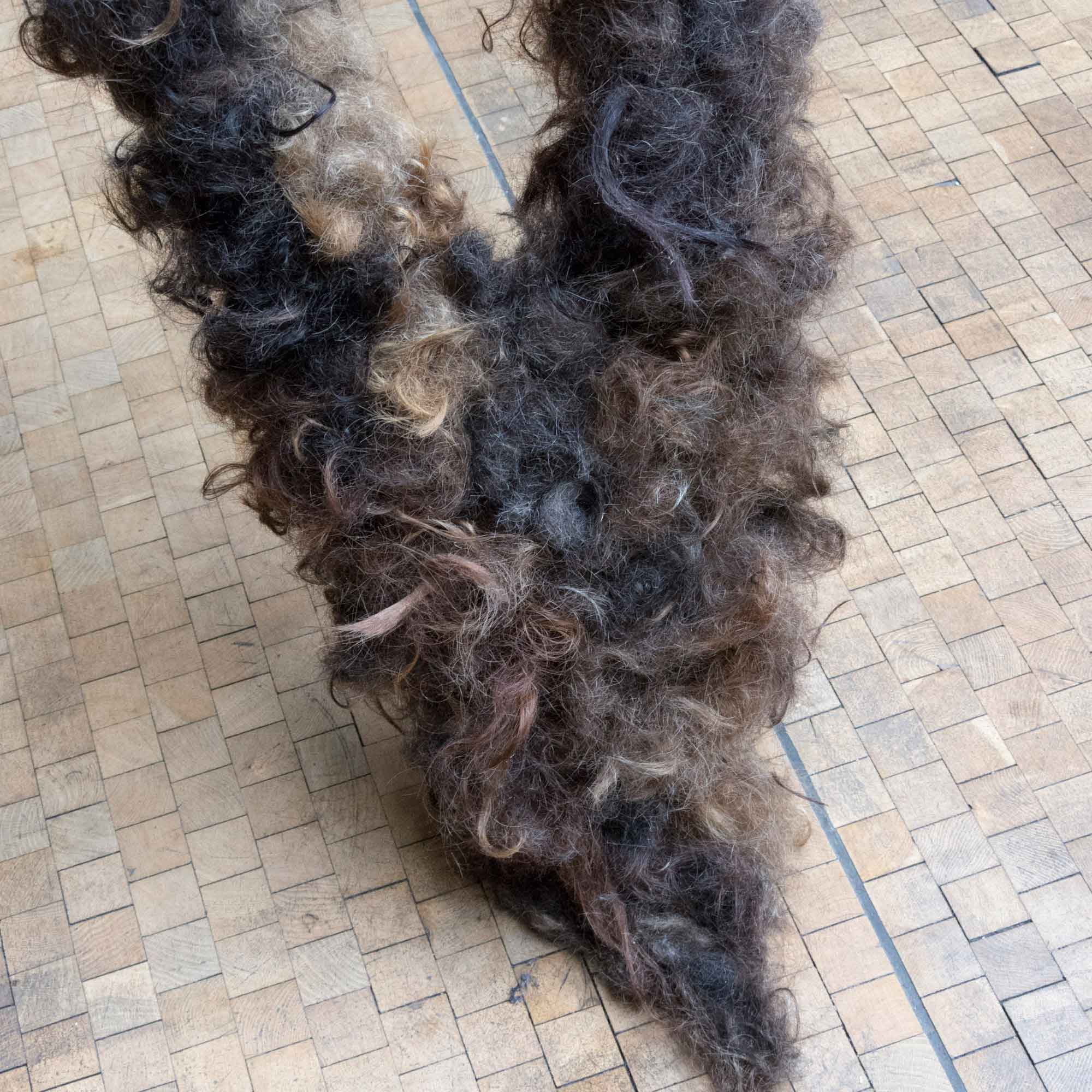 I plaited annealed wire and bound it in horsehair from top to tail. Sprouting from the mouth of the structure are the deep, black hairs from a horse called Rupert. The sheer strength of Rupert’s mane can be seen where it’s fibres rise firmly into the air.