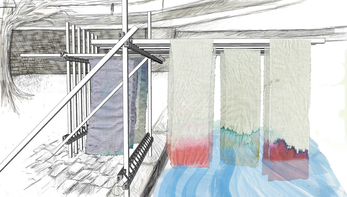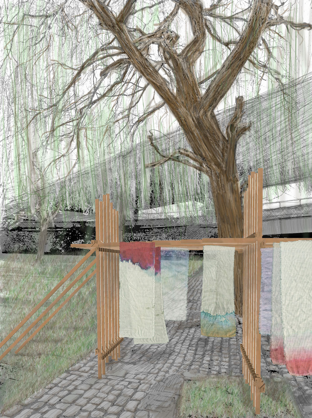 For my final show, I worked on a project proposal of a pop-up installation in Little Venice, London. Working with the Crafts Council to re-imagine an exhibition on craft, I proposed the installation to question what exactly craft is and how it can be exhibited to a wider audience. Inspired by nature, the structure molds to the floor made uneven by tree roots at the site and the hanging drapes of textiles are dyed by the canal and by the weather as time passes; constantly evolving and being crafted by nature itself. I am interested in the definition of craft; is it just something created by humans purposely, or are humans and nature continuously crafting without realising? Using just two parts: timber and a bespoke designed module the installation can slot together into many different forms and can be constructed at many different sites.