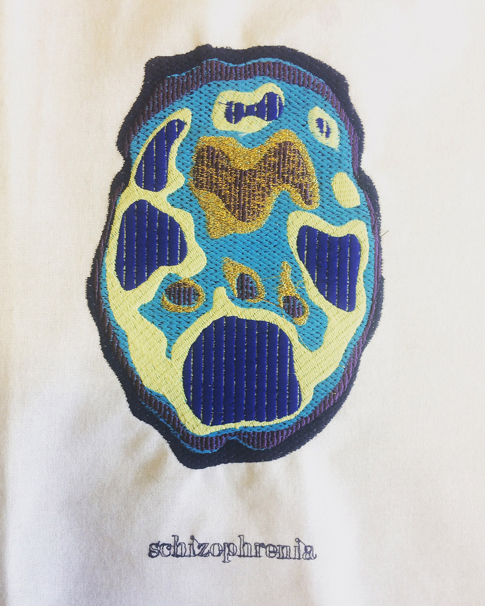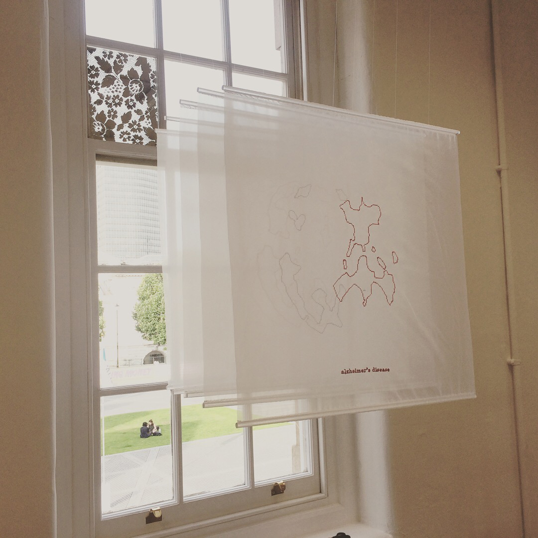 The aim of my work is to raise awareness and de-stigmatise brain diseases through textiles. I have made two pieces, each piece composed of semi-sheer 5 panels that have a tridimensional effect. One piece depicts a PET brain scan of someone suffering from Alzheimer’s Disease and the other one Progressive Supranuclear Palsy; both are neurodegenerative diseases. Each panel is a slice of the brain. I’ve chosen digital embroidery design, as it has the accuracy of a digital machine, like the brain scans do, but also, the stitches have humanity. And I have not used just any stitch: I have chosen to use cross-stitch, as it universally represents the art of stitching and its therapeutic benefits.