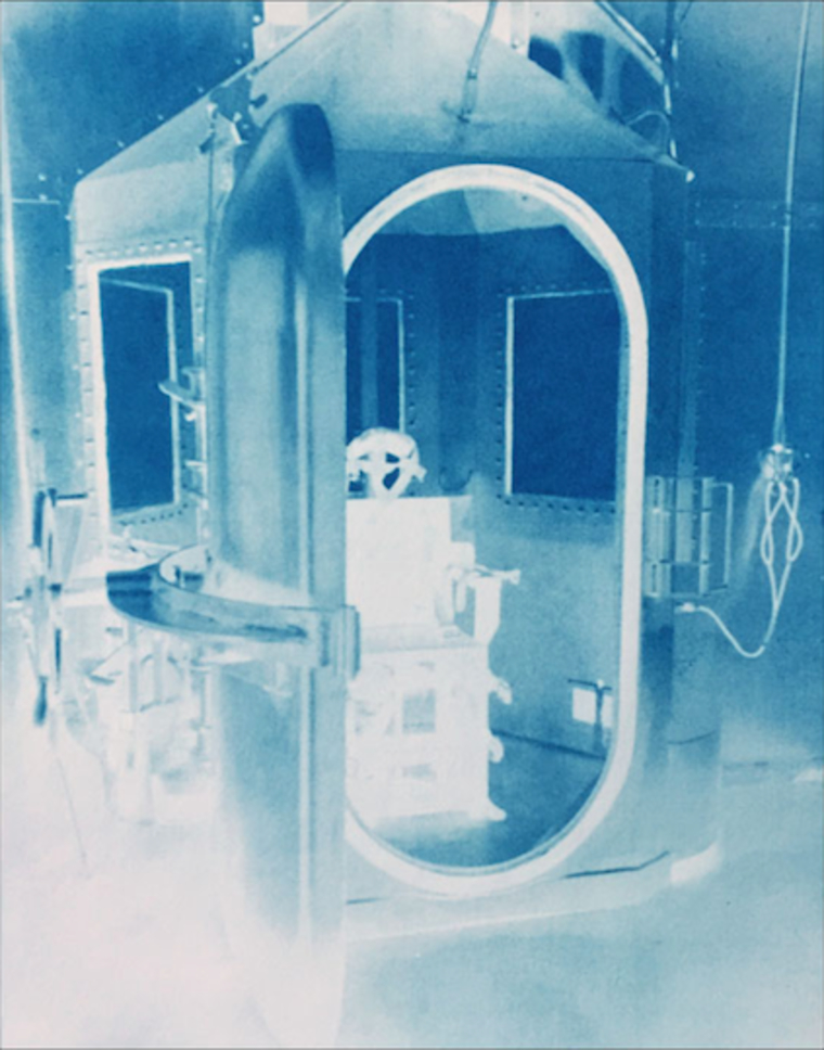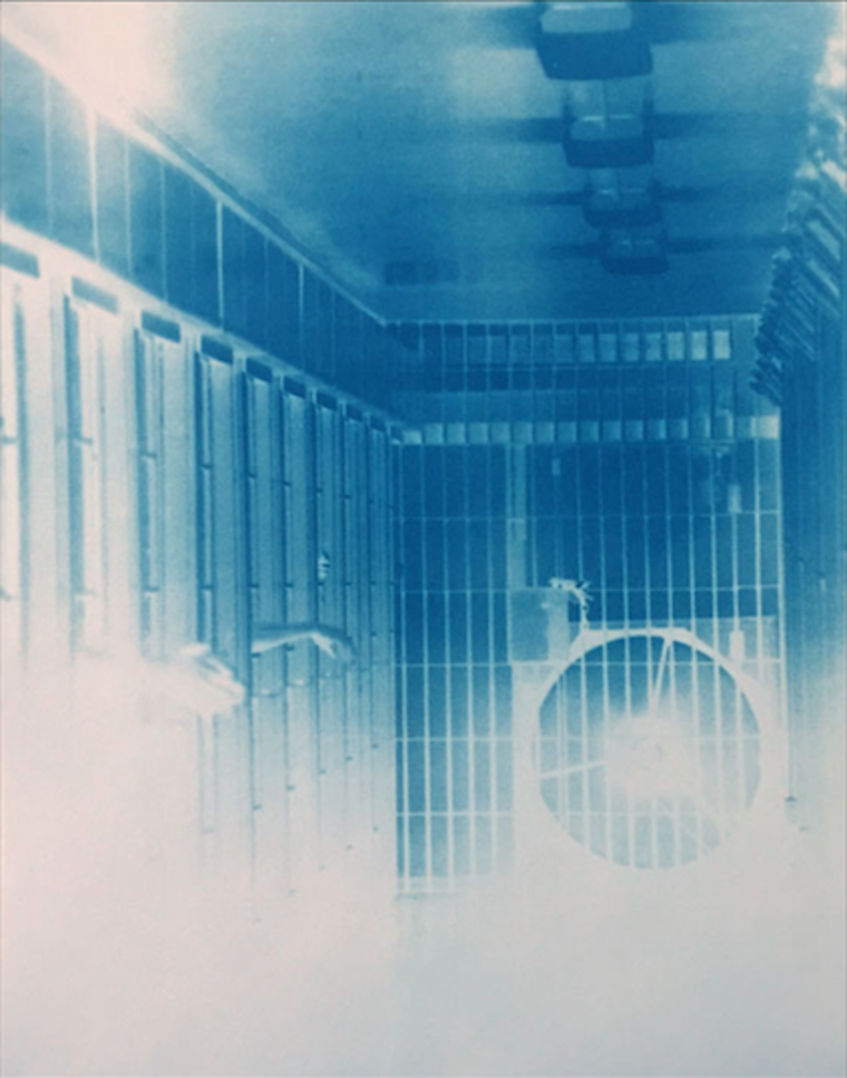David took the 35mm film negatives, exposed them to coating paper with a cyanotype chemical solution, known also as sun prints, to create the ‘Midnight Blue’ series. In one cyanotype image viewers can see inside a gas chamber where executions are performed using hydrogen cyanide, the chemical structure of which is the same as what painters refer to as ‘Prussian blue’, also used by architects for ‘blue prints’, from where the name is derived.