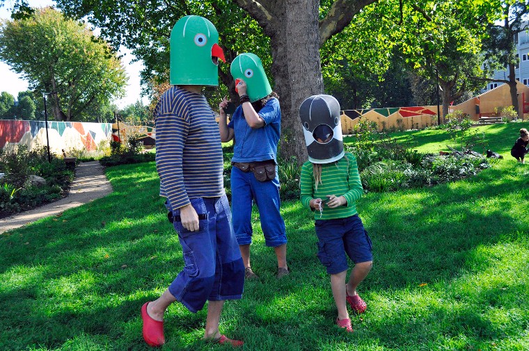 “Currently I have evolved 2 games: Birds on the Street, and Birds on the Grass. These games tell the stories of how House Sparrows and Ring-Necked Parakeets have come to live amongst us in London. With the help of a bird hat players become birds and are given the power of Bird Sense. As birds, players navigate through the city by listening and deciphering bird songs. Players, by roleplaying birds, begin to make birds and their urban environments relevant to themselves. Through playful, non-confrontational means the Animal Diplomacy Bureau hopes to change the way think about animals and our relationships to them.”