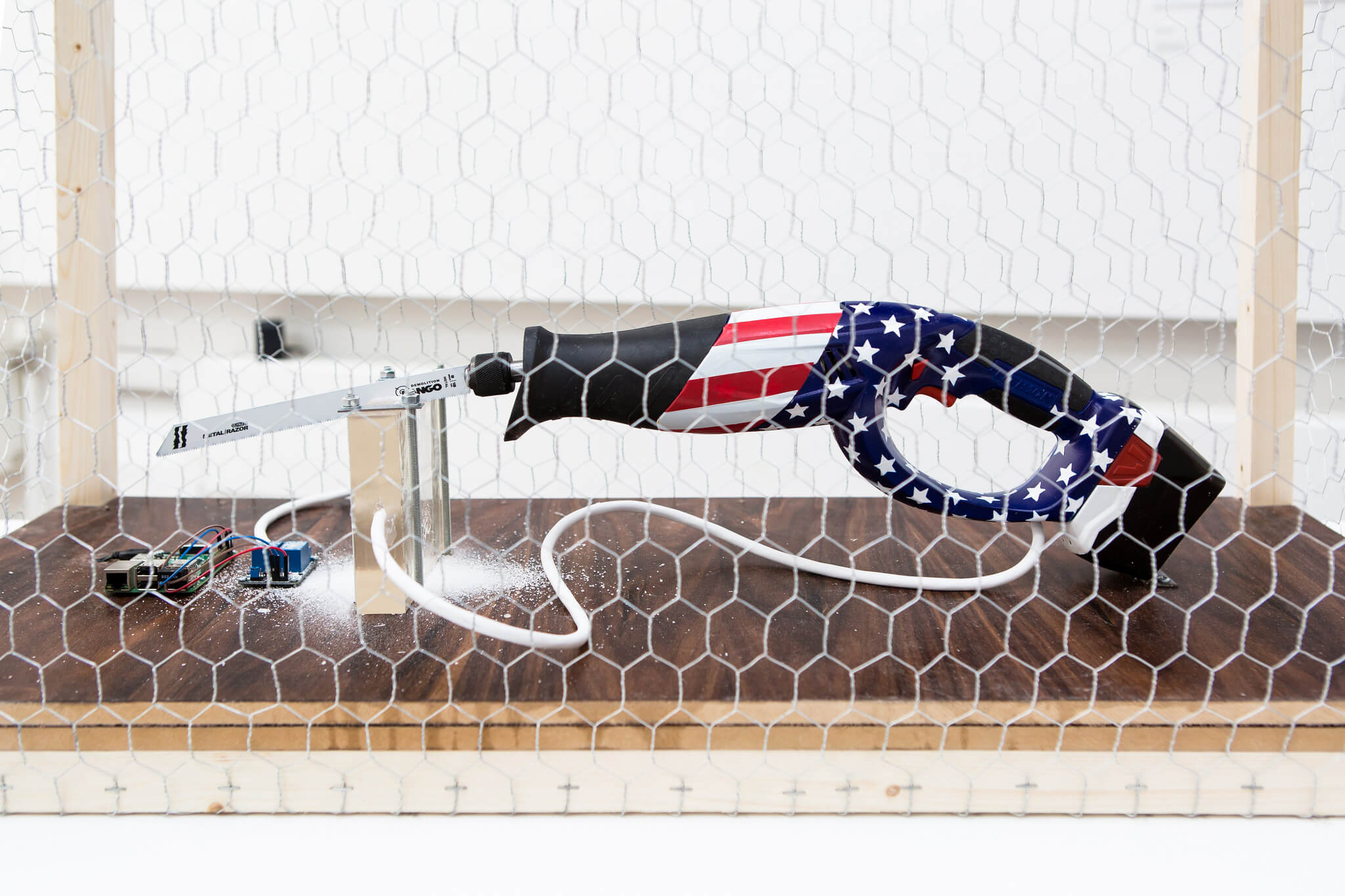 Tudor’s project, America First, focused on Donald Trump’s Twitter feed. Each time Trump tweets, the saw gradually cuts closer to it’s own power supply. Over time, it eventually destroys itself. The BA (Hons) Interaction Design Arts student chose to represent Trump’s aggressive demeanour and self-destructive tweets with the use of the saw as a symbol of the blue collar worker’s frustration, which inevitably lead to Trump winning the election. “The carnage and destruction of the power demonstrates how Trump could potentially neglect to fulfil his promises to the people, which was fabricated to draw them in.”