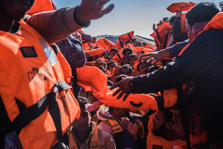 Mediterranean Sea – May 18: Migrants are given life jackets by Spanish NGO Proactiva Open Arms 16 miles off the coast of Libya.