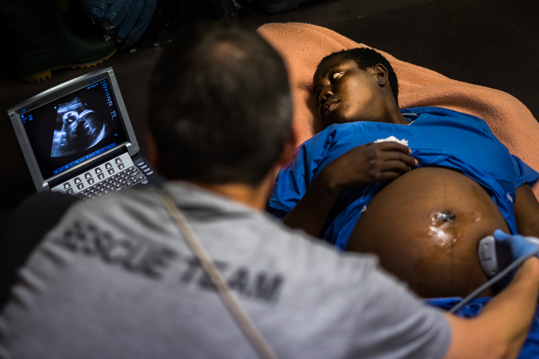 Mediterranean Sea – May 19: Marry, 27 from Nigeria is given a ultra sound at 8 months pregnant from Proactiva Open Arms ship doctor. This is the first time she has seen her baby.