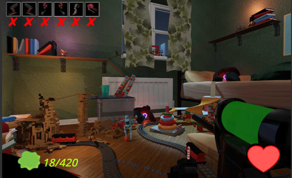 ‘Slime-Time’ showcases Adeel’s work as a 3D environmental artist as well as encapsulating their learning throughout the years on the course. The game is a first person zombie shooter where players are the size of a toy/action figure and have to save a bedroom from other plagued zombie toys.