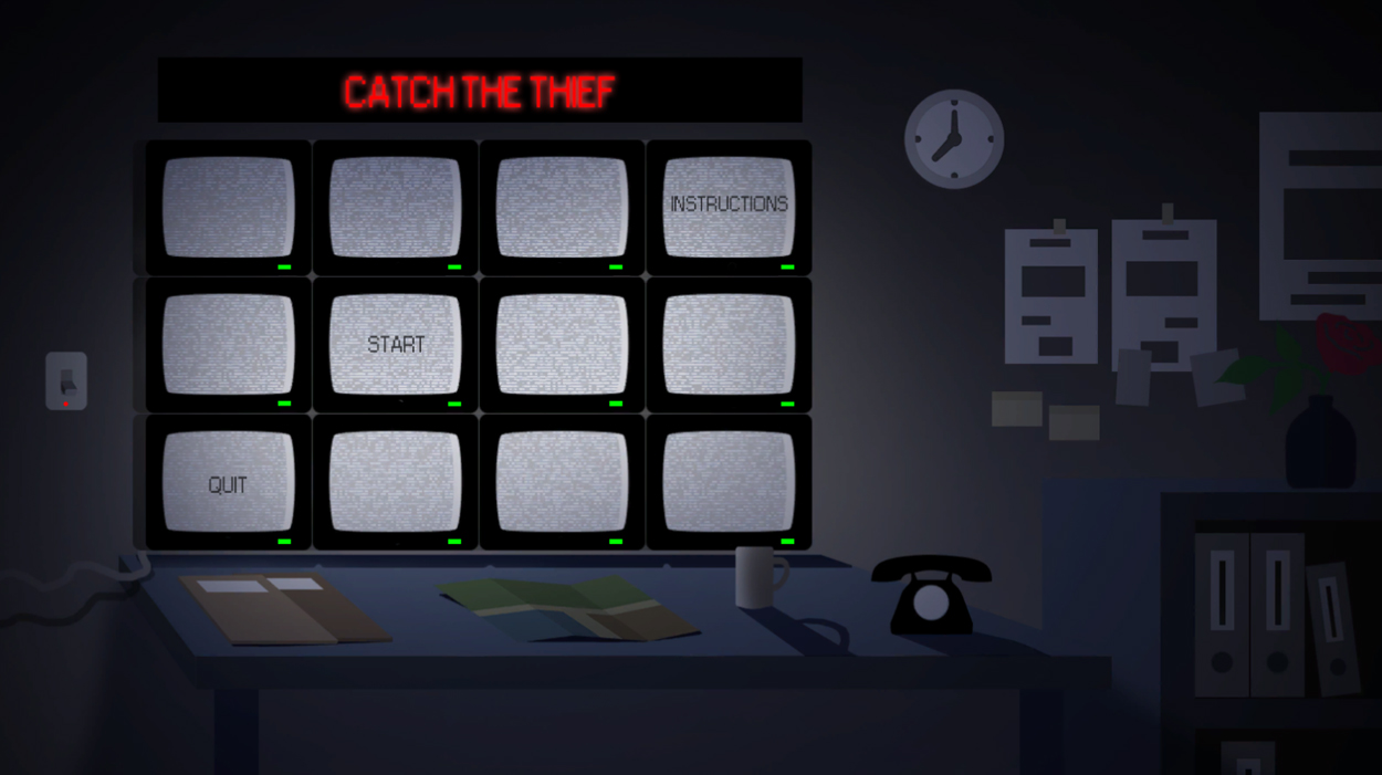 ‘Catch the Thief’ is a mental game which provides a game experience of being a detective to help the victim and the police by careful observation and cautious inference. The initial inspiration for this project came from online crime prevention website ‘Catch a Thief’. Players do not know who the thief is and must make inferences based on the case and finally target the suspect. After that players can observe 12 different surveillance monitors to find out the escape route of the thieves, finally helping the police to catch the thieves.