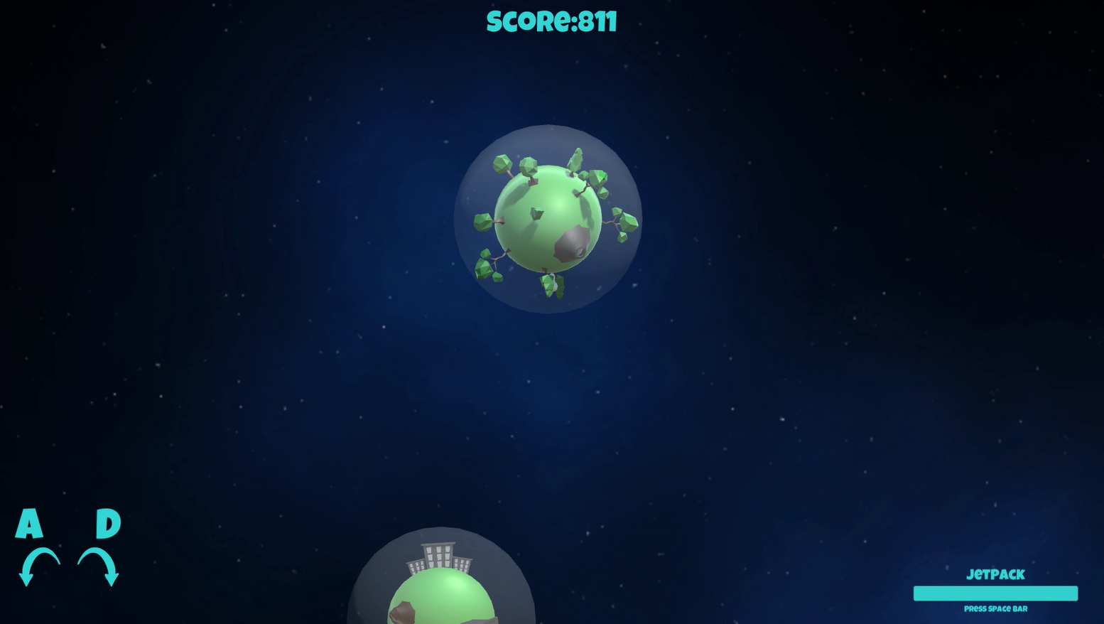 ‘The idea of plate spinning gave me inspiration for this project. I wanted to work on a gravity mechanic for multiple planets that the player could interact with. Players must run around planets to grow different stages of life on them to earn points whilst asteroids that make impact with the planet destroy the stage of life and make the planet a ‘dead planet’, which stops the player accumulating points.’