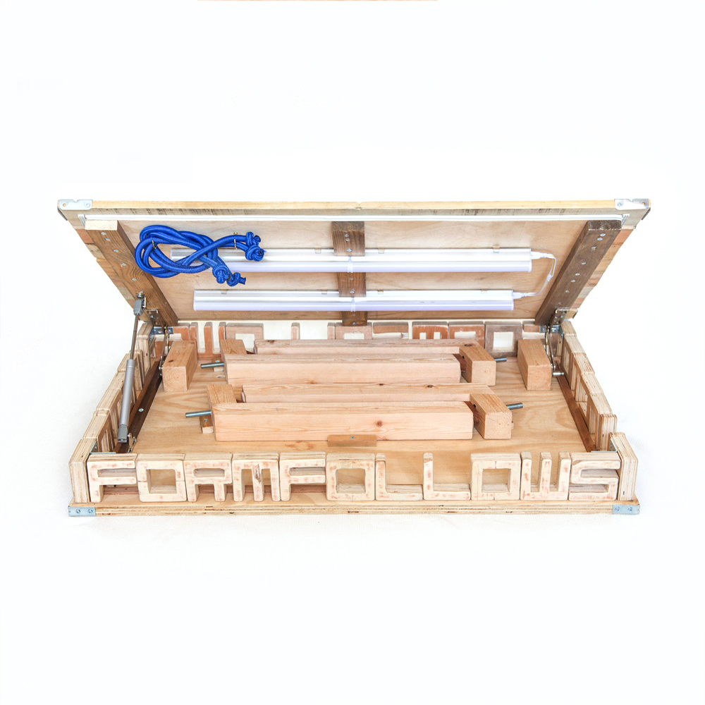 ‘Form Follows Function’ explores the ways in which waste materials can be reclaimed and formed into new products with the key intention of being fully functional. The coffee table was produced from a range of salvaged materials from wood pallets to bungee cord. The letterforms were all hand cut and sanded without the use of any CAD or laser cutting. Based on architect Louis Sullivan’s quote the table is designed to focus strongly on function more than aesthetics, with detachable legs the table can easily be moved and transported. It also includes four 1ft LED tube lights which plug directly into the mains.