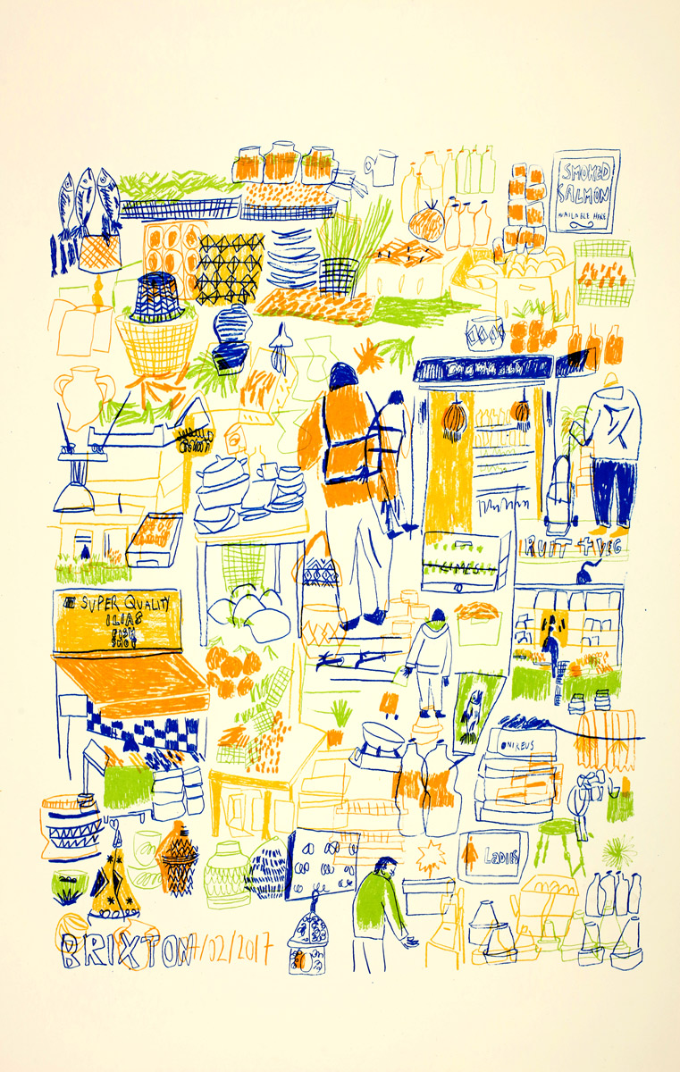 Taking trips to Brixton Market, Laylah experimented with colour and different mediums, and was able to record and act as a sort of reportage artist – culminating in vibrant multi layered screen prints.