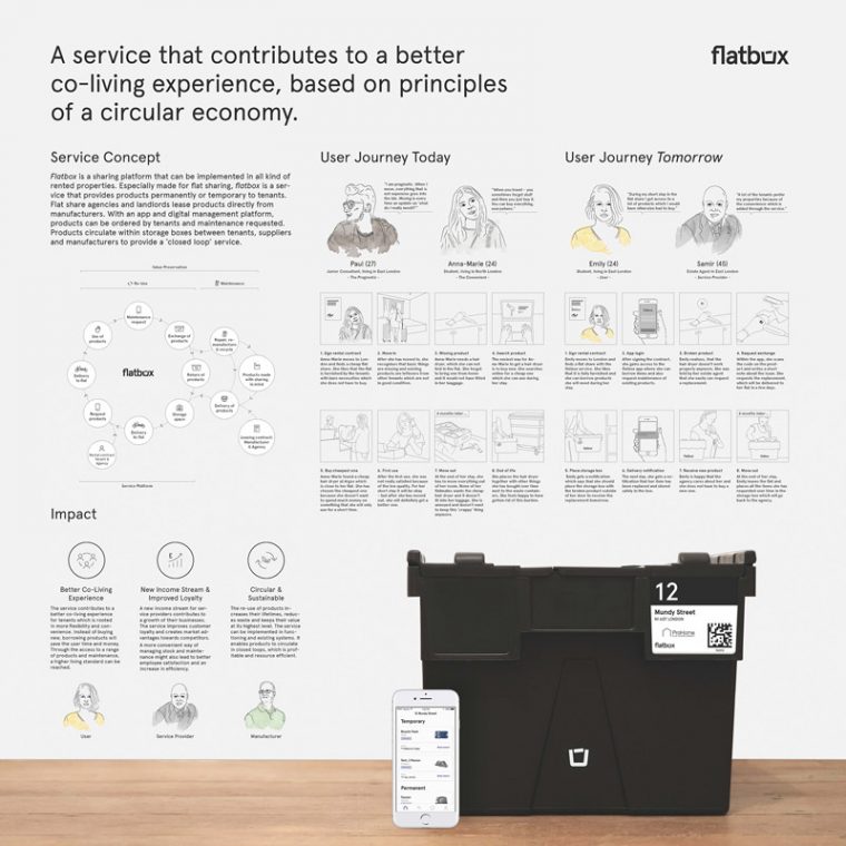 A service that contributes to a better co-living experience, based on principles of a circular economy. Flatbox’ explores opportunities around sustainable and efficient modes of consumption in Central London. Research followed a human-centred design methodology, focusing on circular economy, fast-moving consumer goods, and co-living.