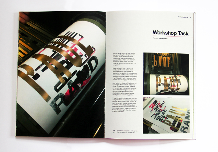 ‘This publication contains critical reflections and visual experiments undertaken for the secret envelope task and my experiences on the collaboration with Letterpress practitioner, Kelvyn Smith and Book Arts technician, Rahel Zoller. It displays my practical and hands-on approach to the collaborative unit and my learnings from it. I engaged in open-ended experimentation without any speculations of the outcome; the focus was on exploration of new materials, media and processes. Attending the collaborative workshop with external practitioners helped me exhibit judgement and technical skill towards the final outcome.’