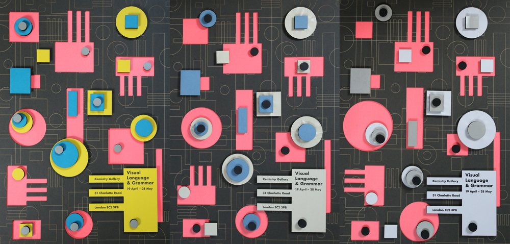 ‘Taking the idea of shape and colour literally my Visual Language and Grammar project played with the idea of displacement and saturation across the poster series. The engraved background provides a constant along with the bright pink and I used layered foam board to give added height to the protruding shapes. I have a PhD in orchestral musical composition and the concept of working with theme and motif has transferred to my visual designs. My posters re-use and re-work shapes in a serialist kind of way, using argumentation, diminution, retrograde and inversion to create rhythmic movement over the three posters.’