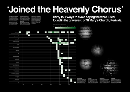 ‘Thirty four ways to avoid saying the word ‘Died’; found in the graveyard of St Mary’s Church, Perivale. I came to this course from a background of working as a photographer and previously teaching English; this poster combines both of these disciplines. Looking at the language on the gravestones I found it really interesting how many different phrases were used instead of the word ‘died’, some more poetic, some a lot more graphic. I put them in a spreadsheet along with the dates they were used and found some of them had a clear pattern. The poster also includes a little about the history of the graveyard and four of the most commonly used phrases.’