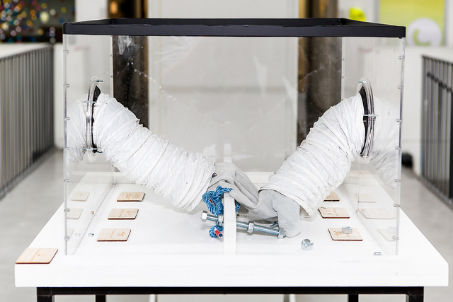 Saffron Parker’s, BA (Hons) Interaction Design Arts graduate, playful installation challenged participants to perform everyday tasks using space equipment with her interactive piece. See more of Saffron’s work here.