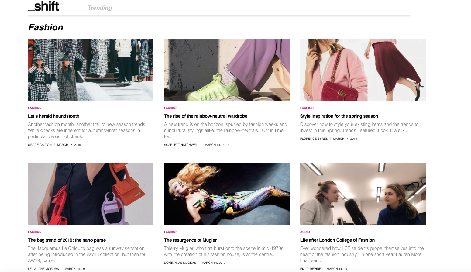 shiftlondon.org – the live website run by students on the BA (Hons) Fashion Journalism at London College of Fashion – has been highly commended for the best newcomer prize at the Student Publication Awards (SPA). The shortlisting recognises BA (Hons) Fashion Journalism students’ hard work and high skill levels. Since its launch in 2016 the site has developed into a well-respected title that is cited by users as an indispensable guide to fashion in London.