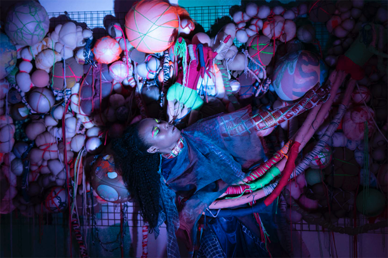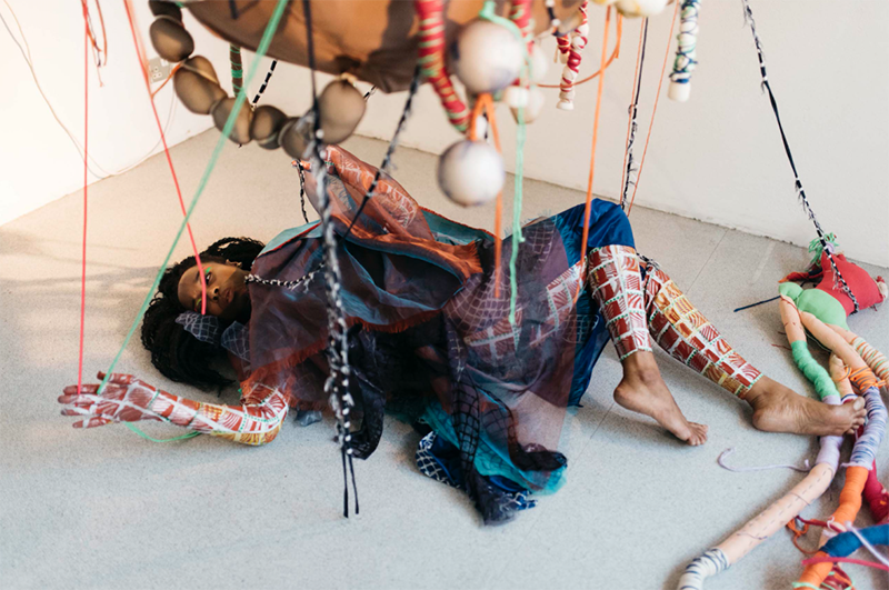 Isabella Dunne, Advaitha Ravishankar, Rebekah Smith, Ying Zhang worked with designer Sarah McNabb, fashion designer Louise Gray, sound designer Shervin Shaeri (Mutant Jukebox) and dance artist Alethia Antonia to create the Break Factor Exhibition, curated by Polona Dolžan. BA Fashion Textiles students collaborated to set up an immersive installation aiming to explore textiles in performance. The cross-discipline collaboration allowed innovative textile techniques and processes, creating a setting for a series of performances.
