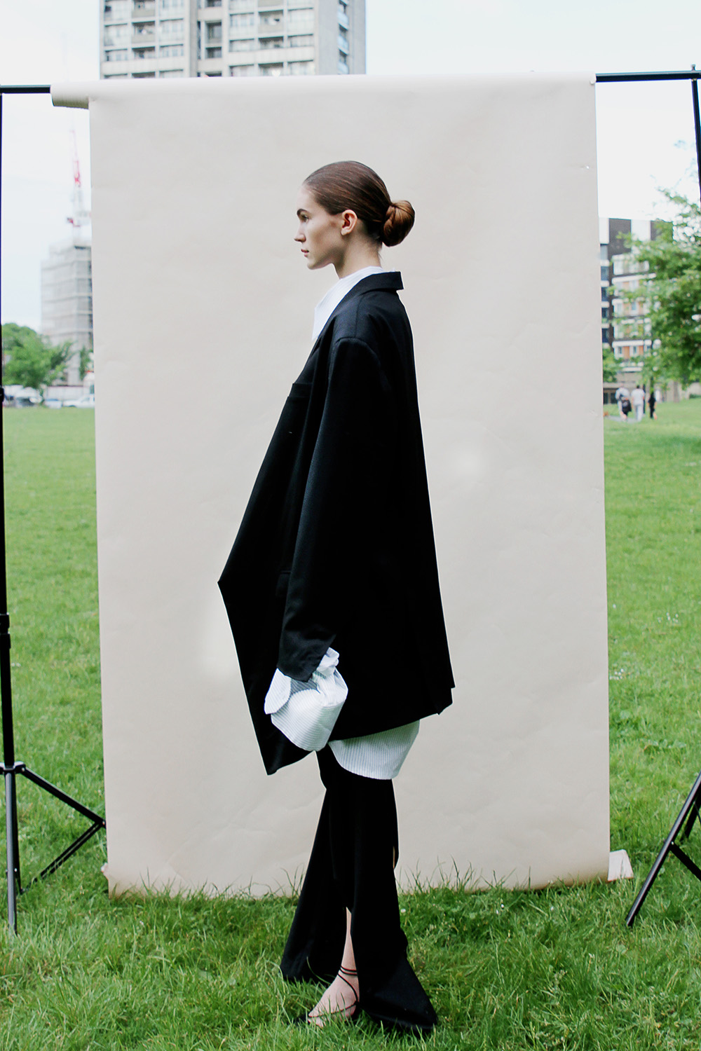 Some pieces are based on a combination of garments into one, so I was working on a complex construction of the garment trying to make it work inside the way that it looks effortless and spontaneous. For other pieces I was discovered some subtle tricks to make a garment keep a hint of shape, it was taken from and support volume that appeared while primary experiments.