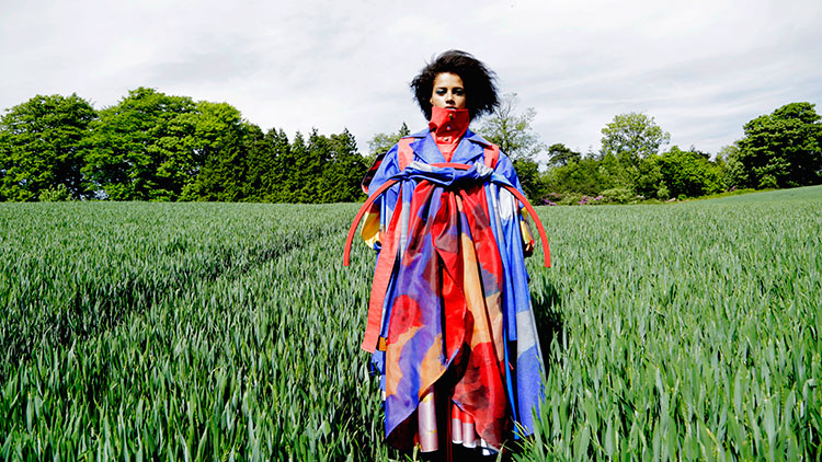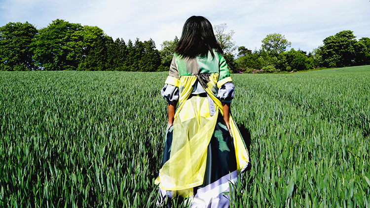 I wanted the collection to be a ode to multi-cultural families like mine and all they have done for Britain. In the case of my family my great-grandparents were enlisted from India to fight for Britain in World War II, and then settled down in England working for services such as British Transport and the health services. This is why you will see military and work wear references mixed with late 19th century silhouettes from India and the Caribbean. I also wanted to capture the dreams and hopes of coming to Britain and how one might imagine Britain and its famous countryside, which is why I took inspiration from 50s British railway posters which presented the most incredible landscapes in an attempt to entice tourists. I collaborated with Hannah Zahran a Fashion Textiles: Print student – I asked her to reimagine landscapes in this style using vibrant colours inspired by India to highlight the concepts I’m exploring even further.