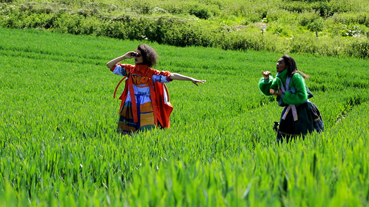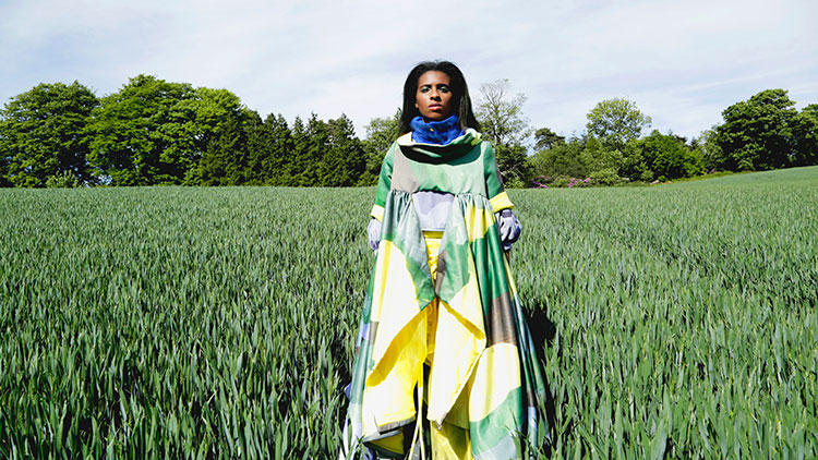 I also wanted to capture the dreams and hopes of coming to Britain and how one might imagine Britain and its famous countryside, which is why I took inspiration from 50s British railway posters which presented the most incredible landscapes in an attempt to entice tourists. I collaborated with Hannah Zahran a Fashion Textiles: Print student – I asked her to reimagine landscapes in this style using vibrant colours inspired by India to highlight the concepts I’m exploring even further.