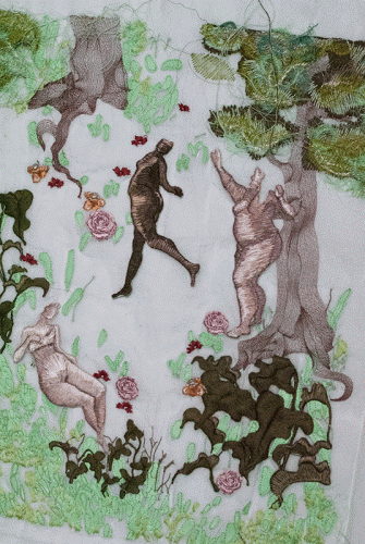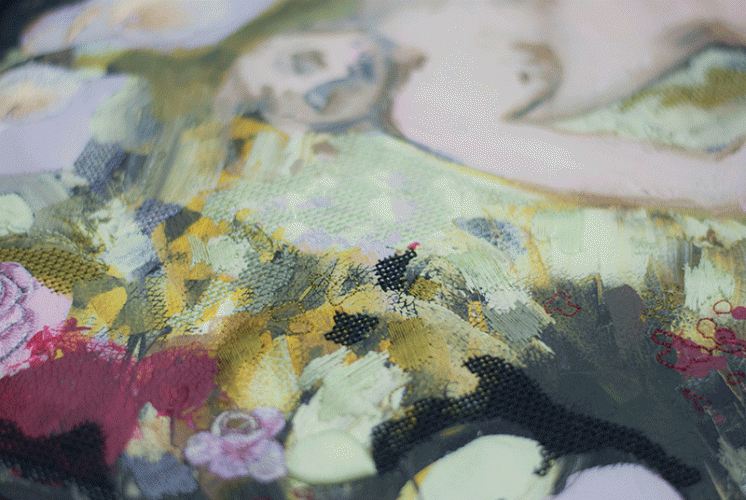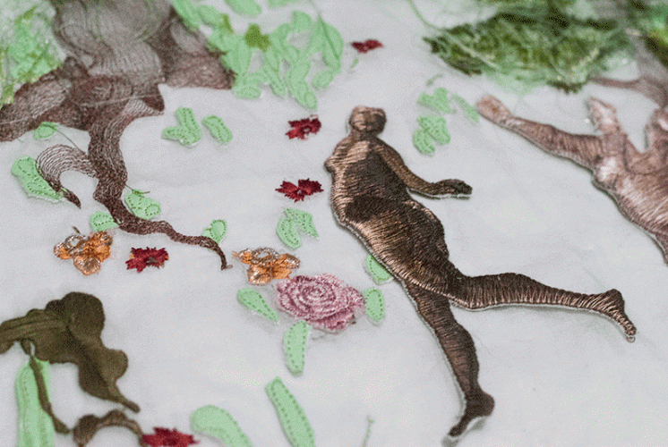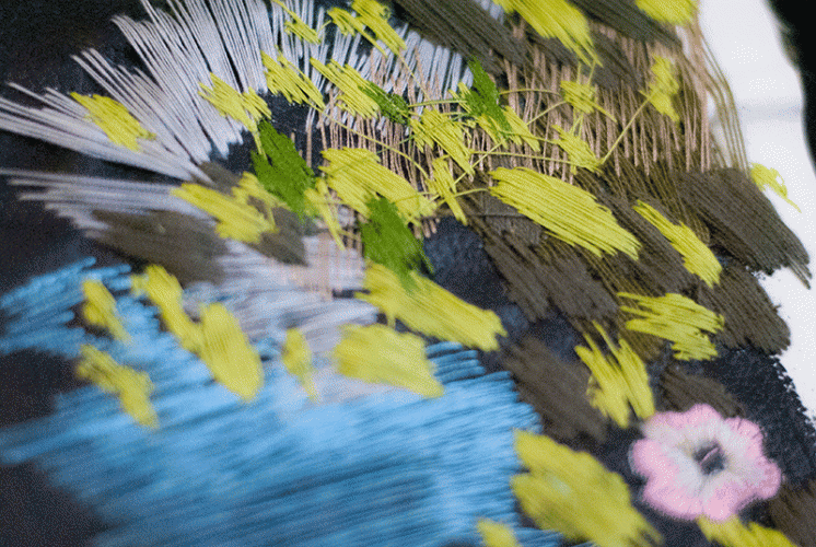 I’m not going to lie; I struggled a lot at first. Getting all the design references right was a real process on its own and it was total trial and error. After that, I still had to overcome technical challenges – to really push the embroidery techniques to the maximum so that I could bring to life what was designed on paper. After trying and failing to realise my designs with lots of different techniques I ended up settling for computer-led embroidery design. This allowed me to create really intricate pieces with layered thread that emulates that paint-like effect I originally wanted. My final pieces of work are a canvas-looking garments that are covered in embroidery and painting.