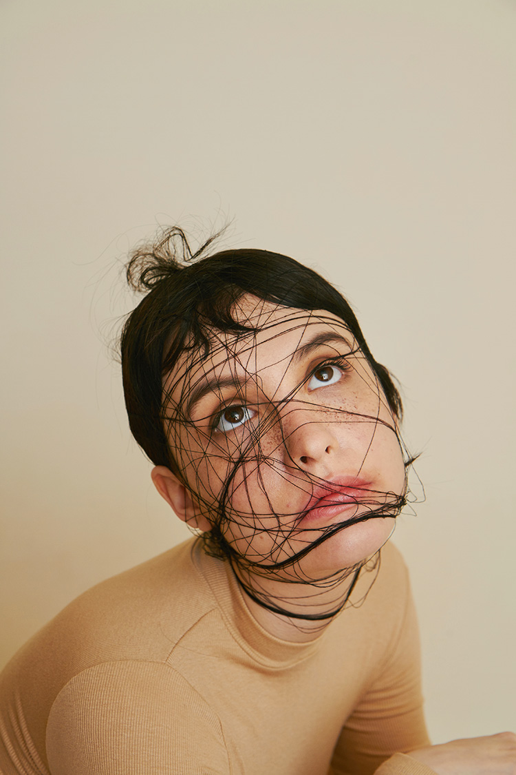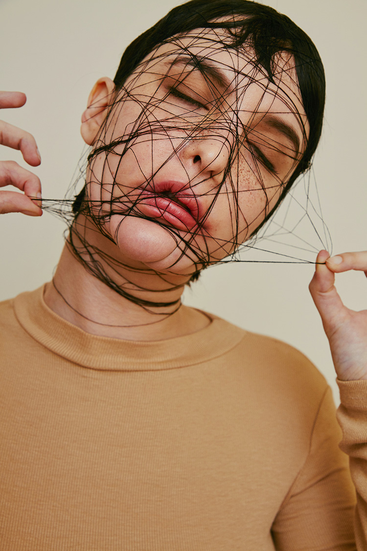When people think about beauty, they seem to have in mind someone who is tall, thin, has a flawless, symmetrical face and blonde hair. Their make-up should feature perfect eyeliner and contouring, glowing skin and sharp, well-defined eyebrows. It tends to be the media that dictates women’s appearance and what is beautiful and what isn’t. I wanted to make the point that women are bound and trapped by conventional ideas of beauty and the threads symbolise imprisonment.