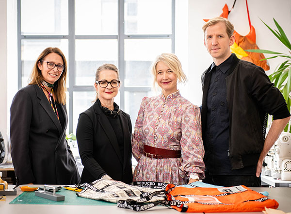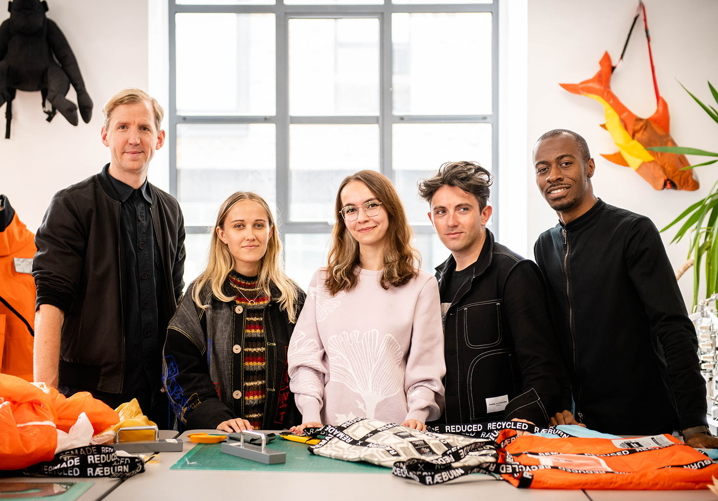 (L to R) Designer Christopher Raeburn, with young designers Bethany Williams, Sabinna Rachimova, Daniel Fletcher, and Emile Vidal-Carr, at the launch of the Fashion District, which is a new hub for fashion innovation that aims to return world-leading fashion manufacturing and design to the east end, held at Christopher Raeburn’s studio in London. Photo: John Nguyen/PA Wire