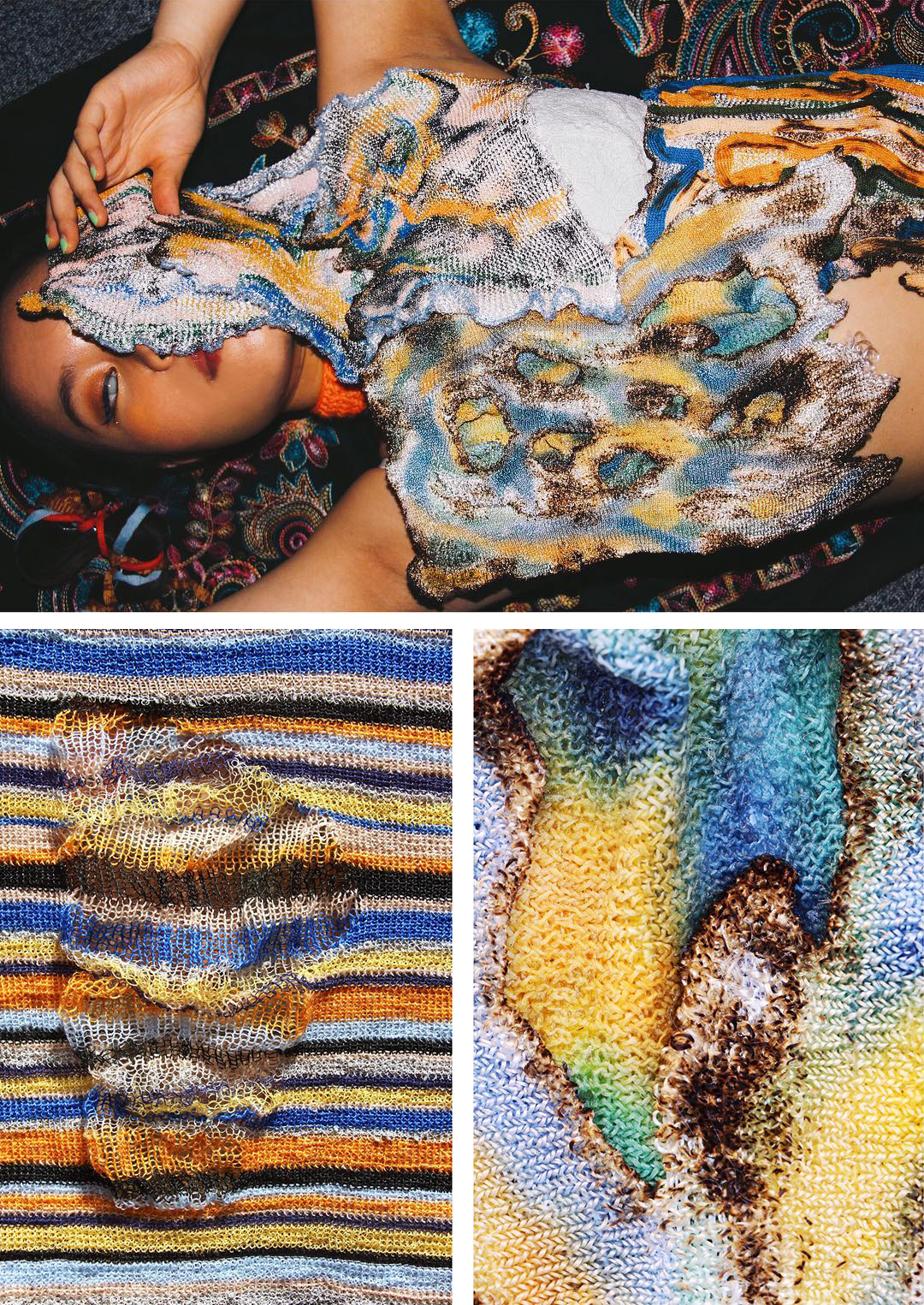 I could potentially get inspiration from anything. Any form, texture, colour, movement, performance, painting, sculpture, installation, landscape, weather or just ordinary lives. I bring in interpretations of all this visual information and turn it into knits through several development and experiment stages.