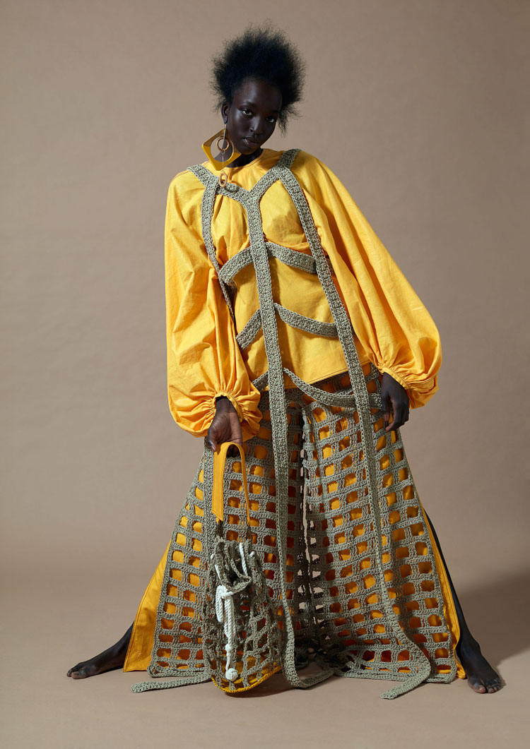 Uniformed shapes of crochet dominate whole mood of this collection, and create new directions of natural material and contrasts to shiny linen fabrics. Those two different textiles combined in the look are sophisticated and unique. As crochet is considered as a kind of macramé technique, all outfits in this collection deliver new style of natural mood of knitting comparing to machine knitting. The collection shows one of the original crafts in Spain – knit craftsmanship with use of natural hemp cord is used in the whole collection