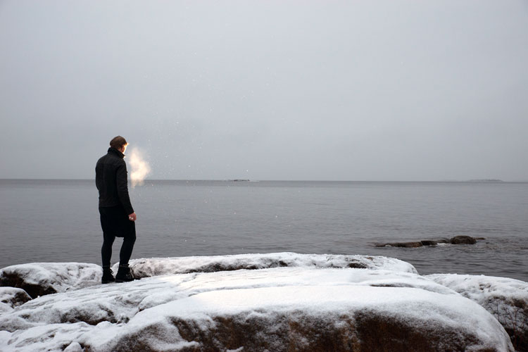 The exhibition plays with the idea of that photography is an act of observation that collapses our superposition. At the water’s edge in Fäboda, Jakobstad, Finland, Paul performs the superposition in a series of images depicting multiple states. Moving from one side of a rock to another, he positions himself to the left and to the right of the frame. This also marks out the possible space of a ‘double-slit experiment’, which is another scientific demonstration of the superposition. In the double-slit experiment (first performed in 1909), particles pass through two slits and project an interference pattern onto a screen. The interference pattern suggested the bizarre co-existence of both waves and particles.