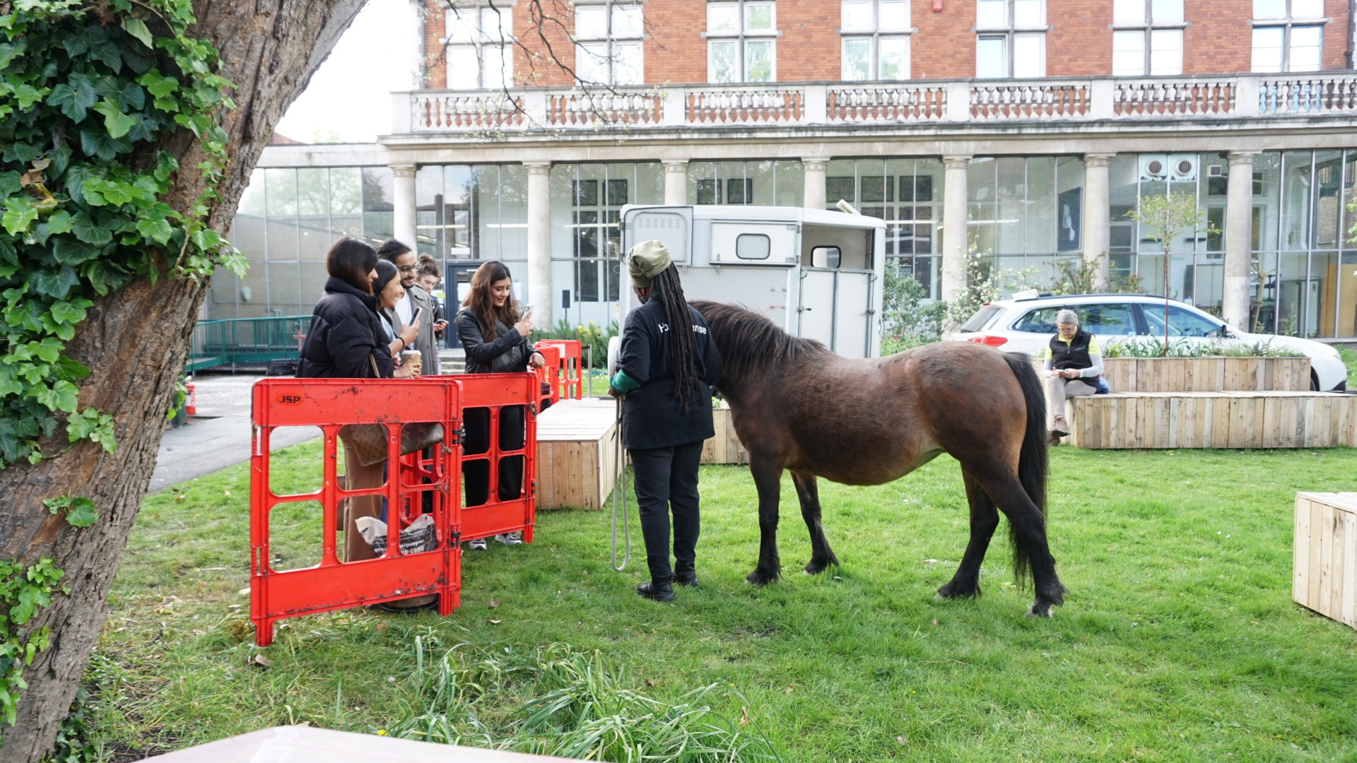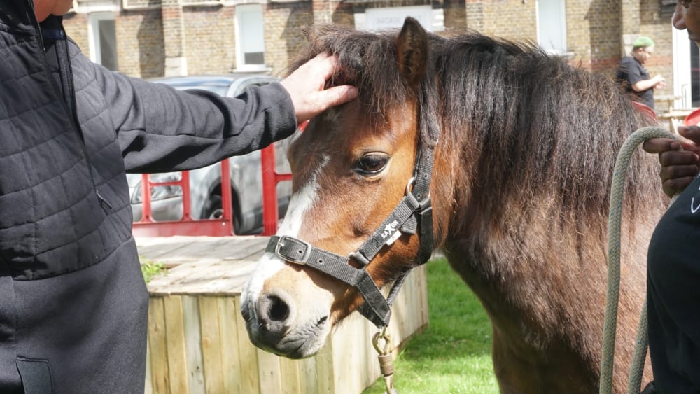 To celebrate Earth Day 2022, London College of Fashion, UAL hosted a series of interactive workshops at our John Prince's Street and Mare Street sites. The fittingly named ‘Inviting a Mare to Mare Street’ workshop caused quite the buzz. The equine-assisted psychotherapy session, for an intimate selection of staff and students, was found to be a grounding way to unwind before the weekend. Facilitated by Tim Stephens, Educational Developer (Curriculum) at UAL, a beautiful Welsh Mountain Pony was brought to Mare Street's Courtyard by the lovely team at Horse Sense for Life.