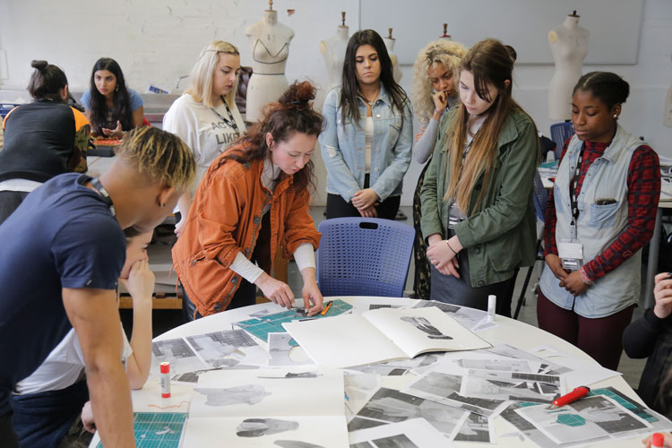 Fashion image workshop: LCF tutors Justine Josephs, Elle Sillinpaa and Kalina Pulit introduced students to the world of Fashion Styling, Photography, Make-up and Creative Direction. With outreach ambassadors Danika Lawrence, Sophie Knight and Grace Briscoe on board it was an action packed day of teamwork. A morning of masterclasses led to students working in groups to style a look for a photoshoot and introduce the ideas behind their work through moodboards and vlogs.