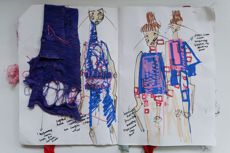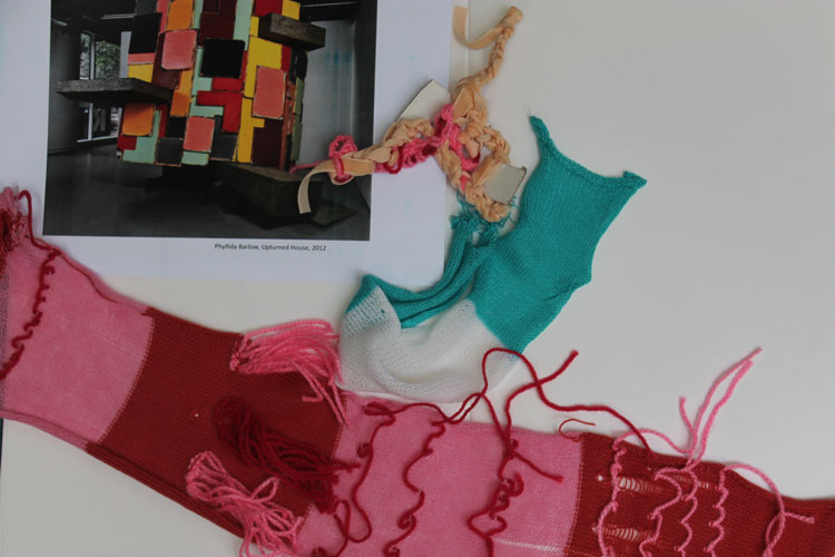 Fashion Knit: LCF tutor Eleanor Warrington and CSM tutor Berni Yates and outreach ambassadors from CSM and LCF Maria Cuji, Amira Sari and Ben Sumpter, worked together to give students the full fashion knit experience. Once students got to grips with the basics of knitting on a machine, they referred back to the three inspirational images and developed ideas based on what they connected to within the image- be that colour, texture, pattern or materials.
