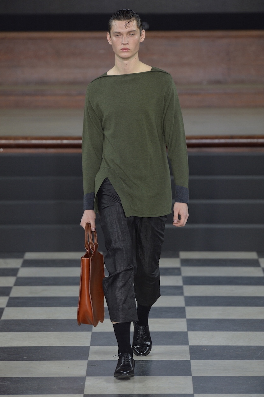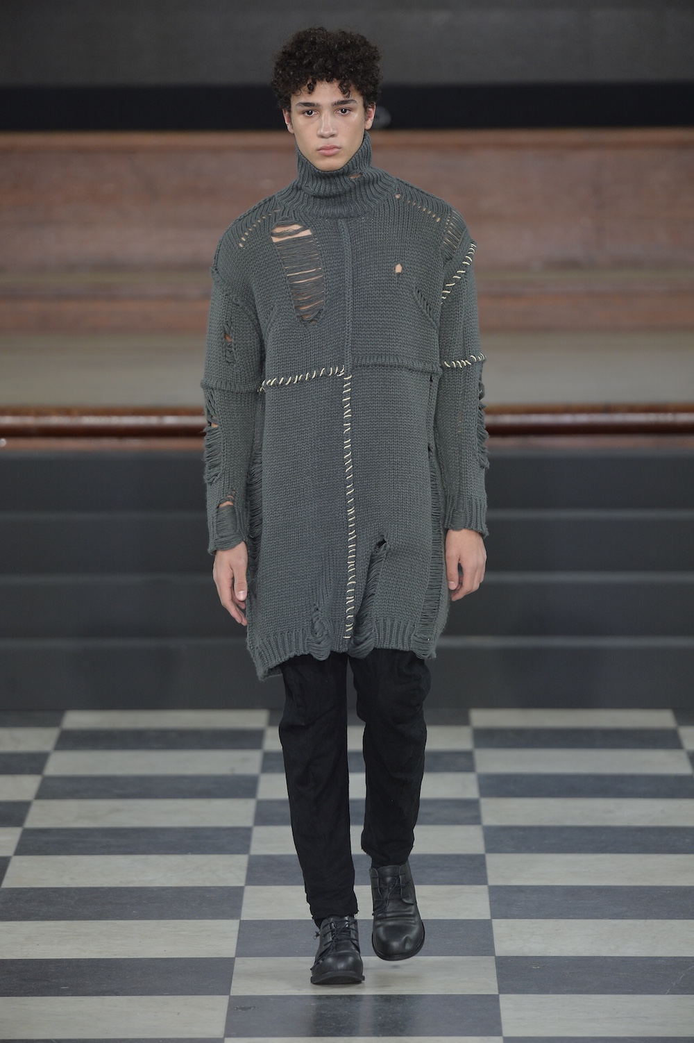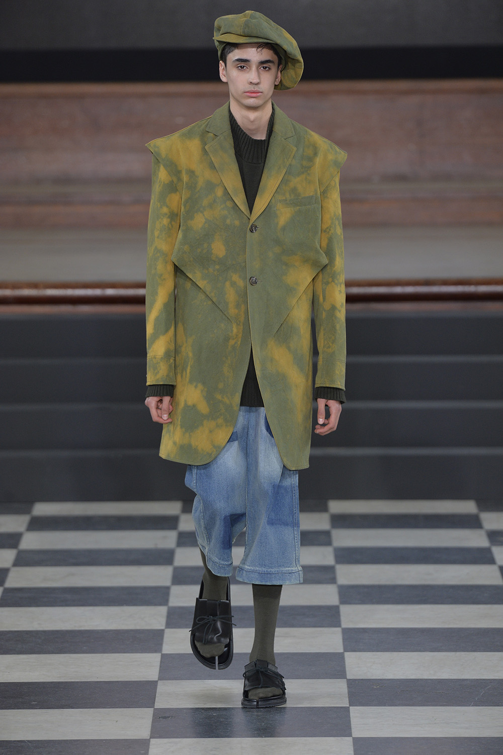 Up next was Tak Lee with his The Additional Man collection that explored the scope of 3D pattern cutting and washing and dyeing of finished garments. He said, “My final collection is to do with the intersection between construction, colour, texture, knitting and, of course, pattern cutting. The project is about creating some radical or ambiguous forms in menswear through 3D pattern cutting skills. I treated all the fabrics with techniques like washing and dyeing and also to damage the fabric to make elements like floating fringes on the surface.” Read the full interview here.