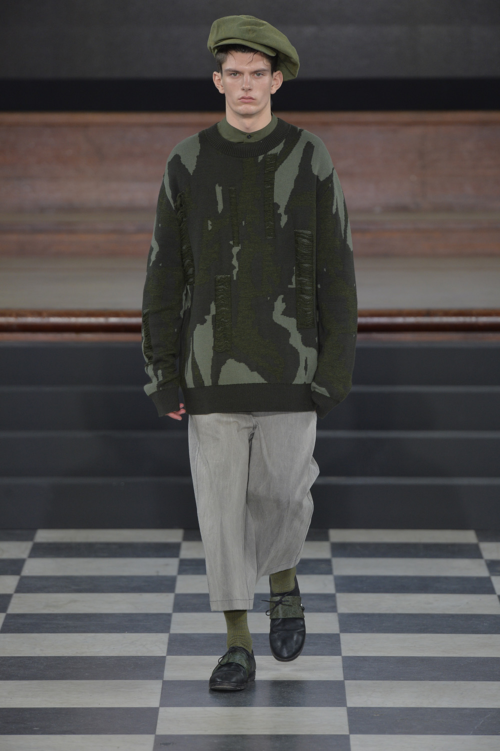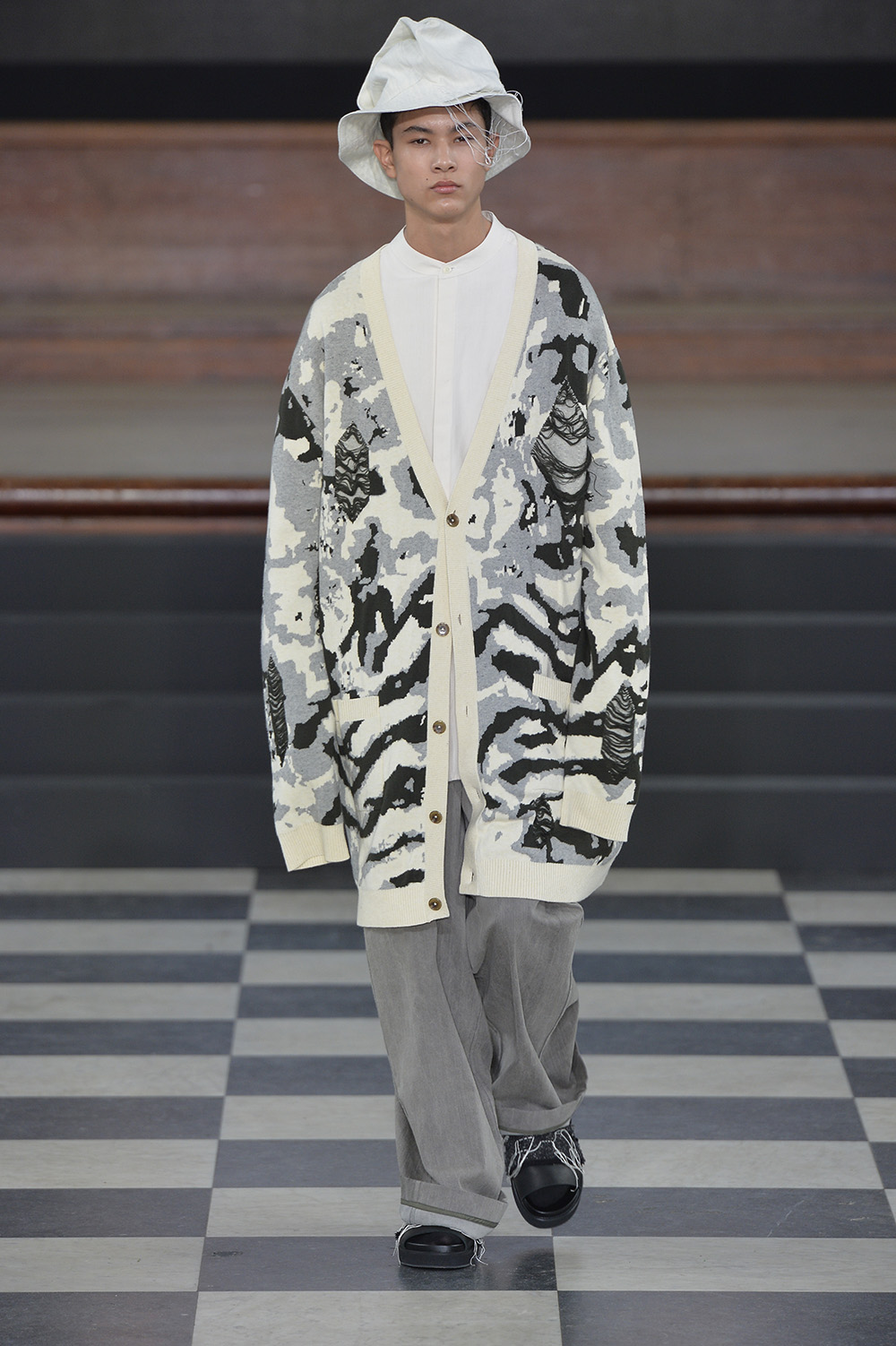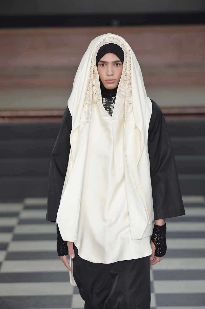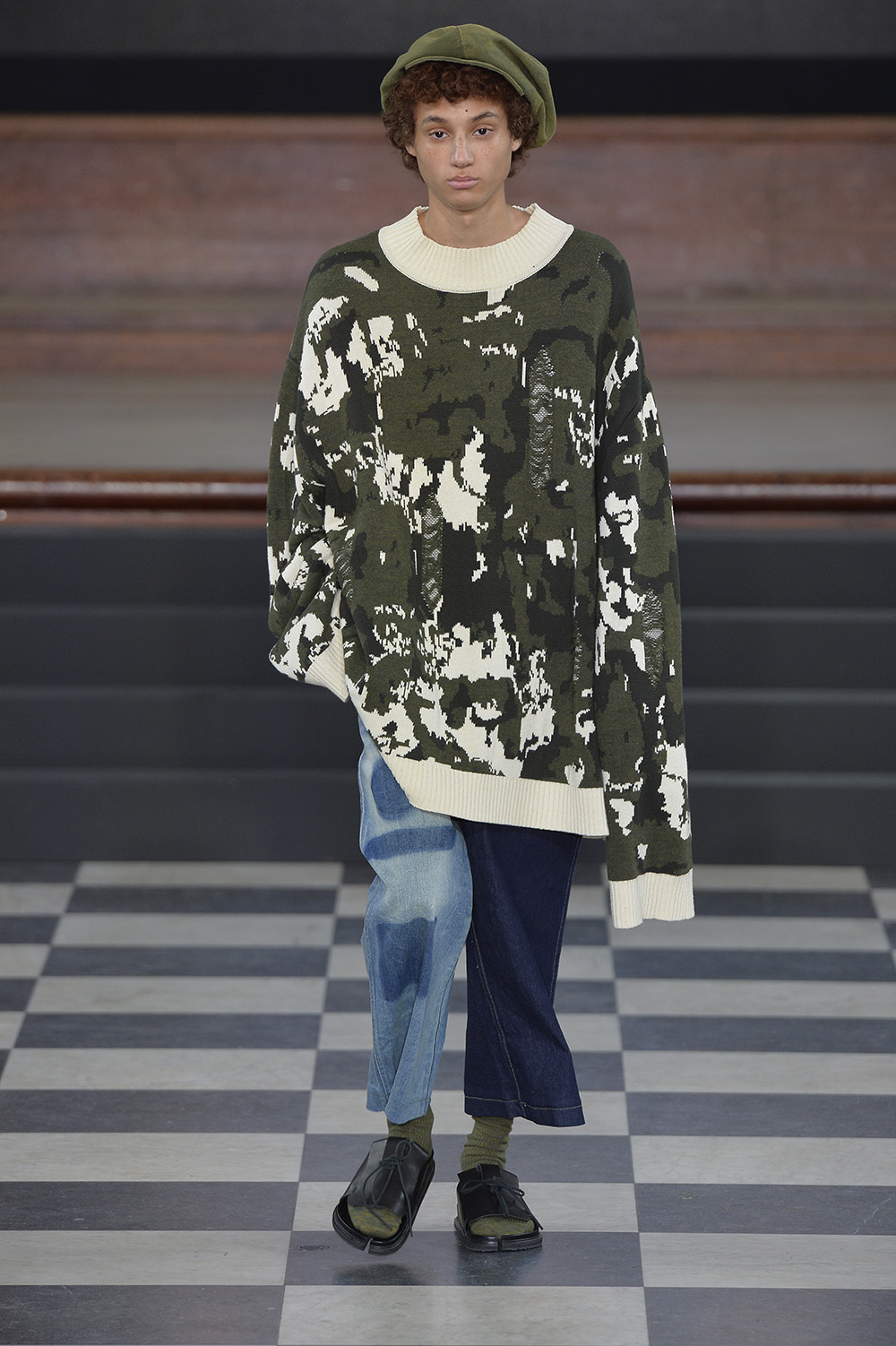 Up next was Tak Lee with his The Additional Man collection that explored the scope of 3D pattern cutting and washing and dyeing of finished garments. He said, “My final collection is to do with the intersection between construction, colour, texture, knitting and, of course, pattern cutting. The project is about creating some radical or ambiguous forms in menswear through 3D pattern cutting skills. I treated all the fabrics with techniques like washing and dyeing and also to damage the fabric to make elements like floating fringes on the surface.” Read the full interview here.