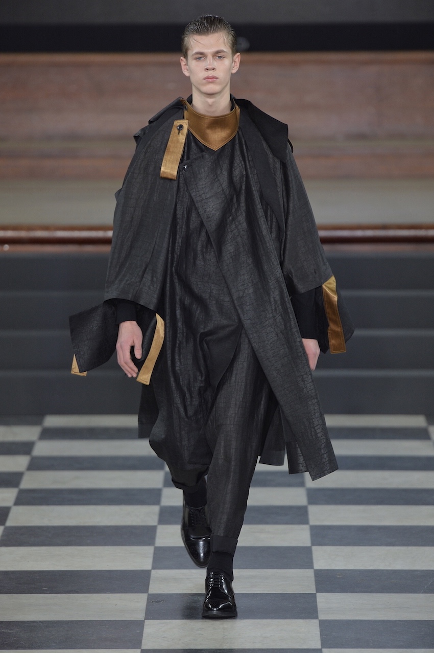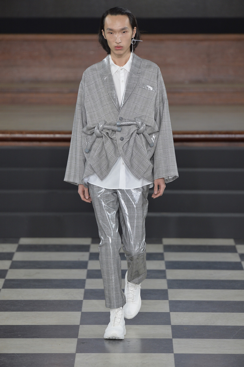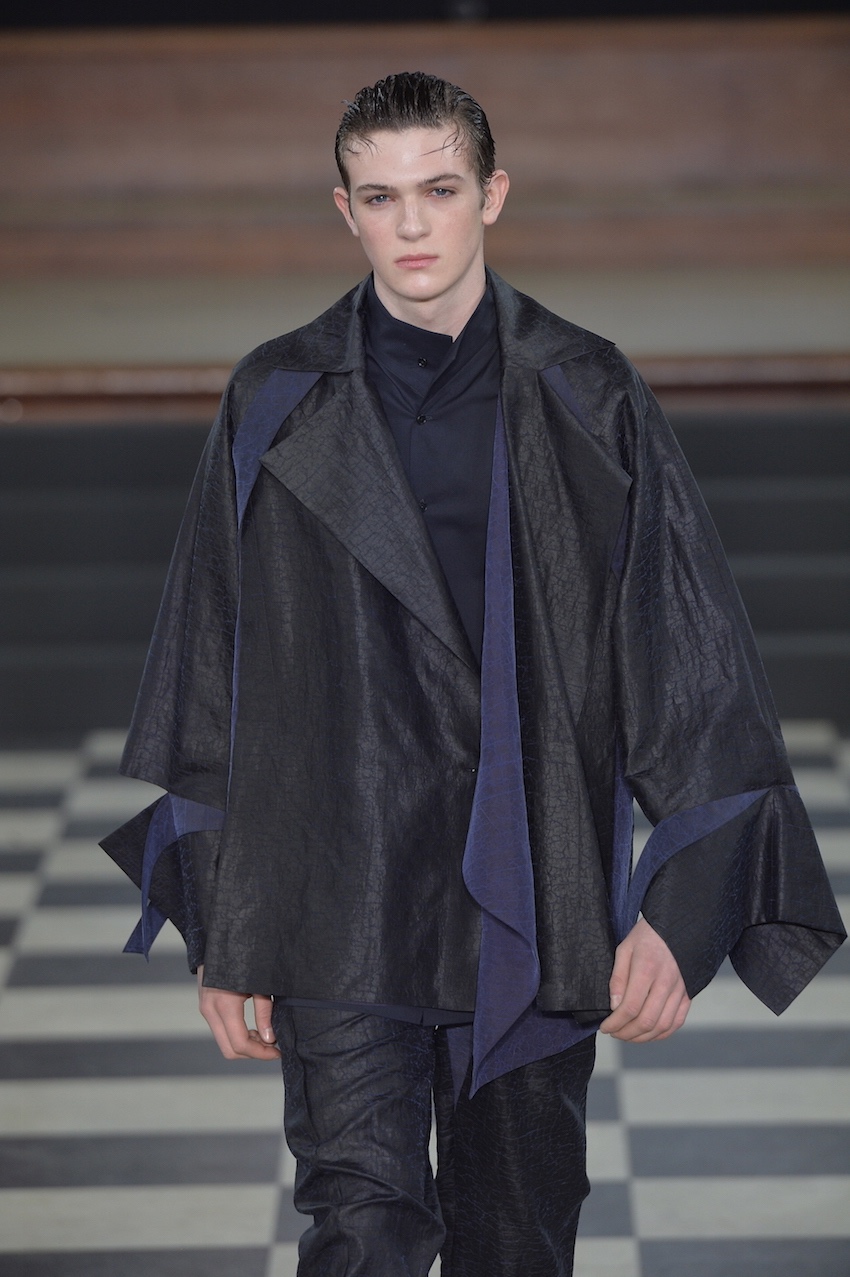 Peng Tai was next out on the catwalk. His collection is about the relationship between men and clothing. He said, “I was thinking about the issue of fast fashion – everybody throws their clothes away and they don’t cherish their garments anymore, not like before when you had your garments for a long time and then gradually the garment became a symbol of you.” His collection, called Man of Feeling, was created by molding postures of the human body with machine and hand seam finishes. Read the full interview.