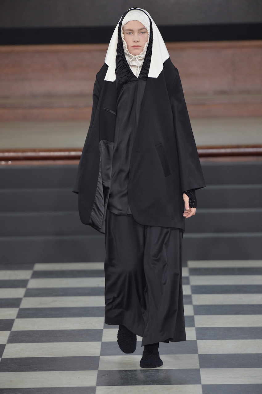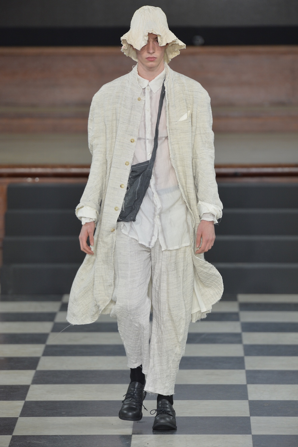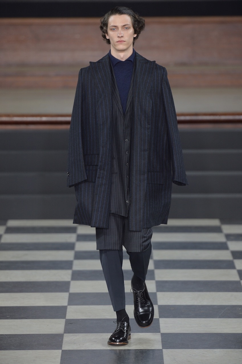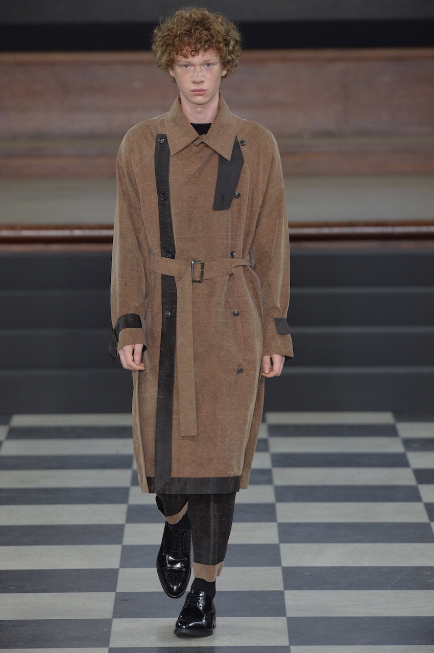 Peng Tai was next out on the catwalk. His collection is about the relationship between men and clothing. He said, “I was thinking about the issue of fast fashion – everybody throws their clothes away and they don’t cherish their garments anymore, not like before when you had your garments for a long time and then gradually the garment became a symbol of you.” His collection, called Man of Feeling, was created by molding postures of the human body with machine and hand seam finishes. Read the full interview.