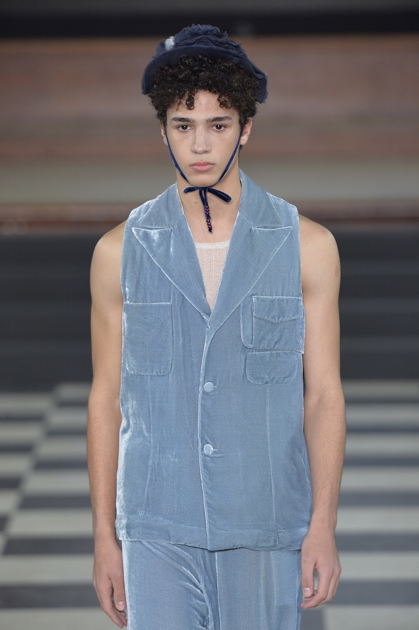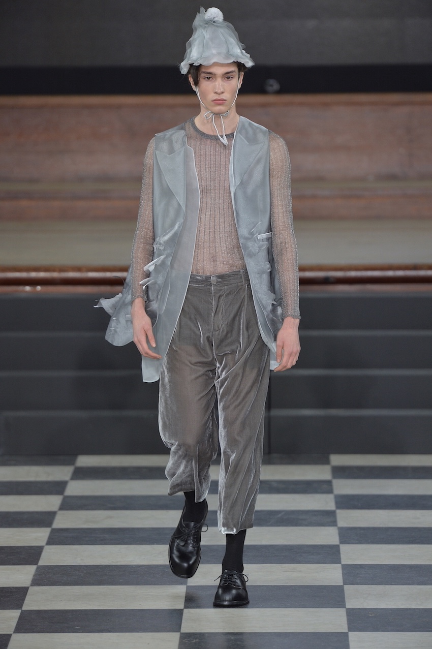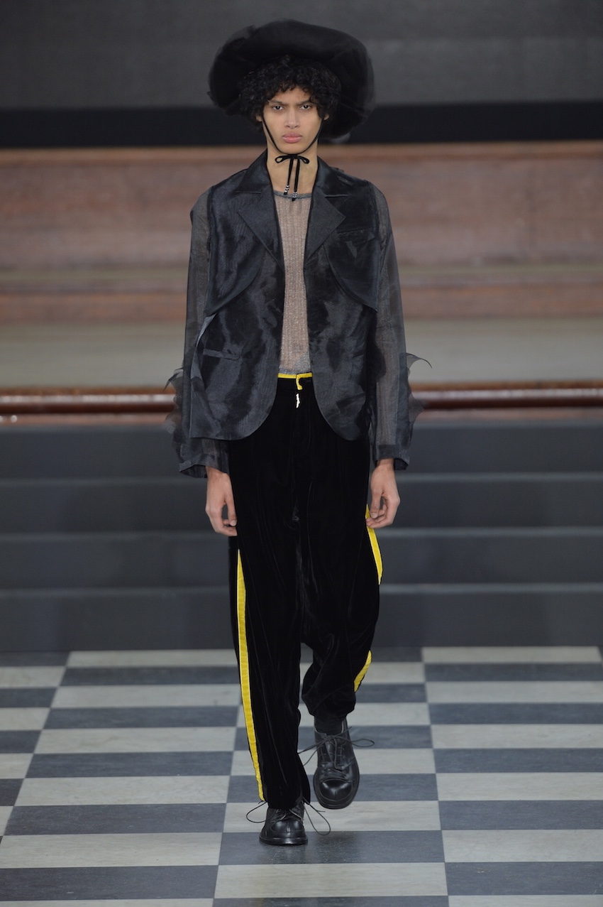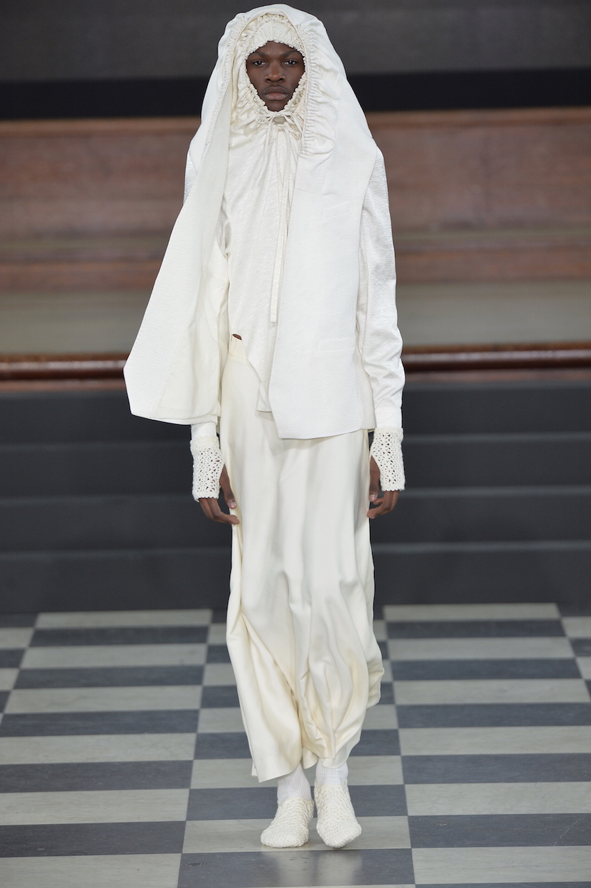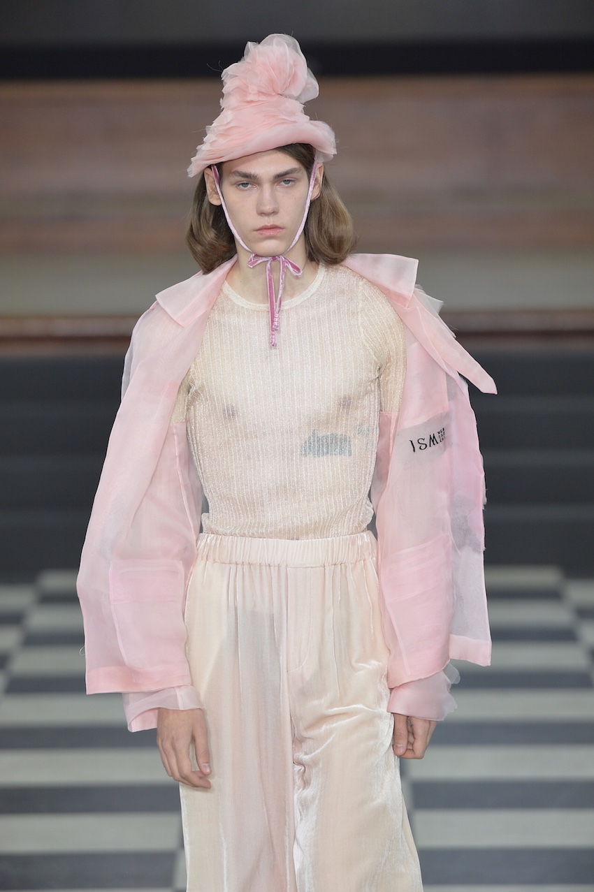 Soo Jin Cho said her collection was “based on French Literature, during the period of romanticism – it represents methods of synesthesia in literature. The collection is a translation of art history, into commercial fashion.” Soo focused on how the axis of tailoring changed from the shoulder to the head, concealing the classical male form, revealing and focusing on the male face. Read our full interview here.