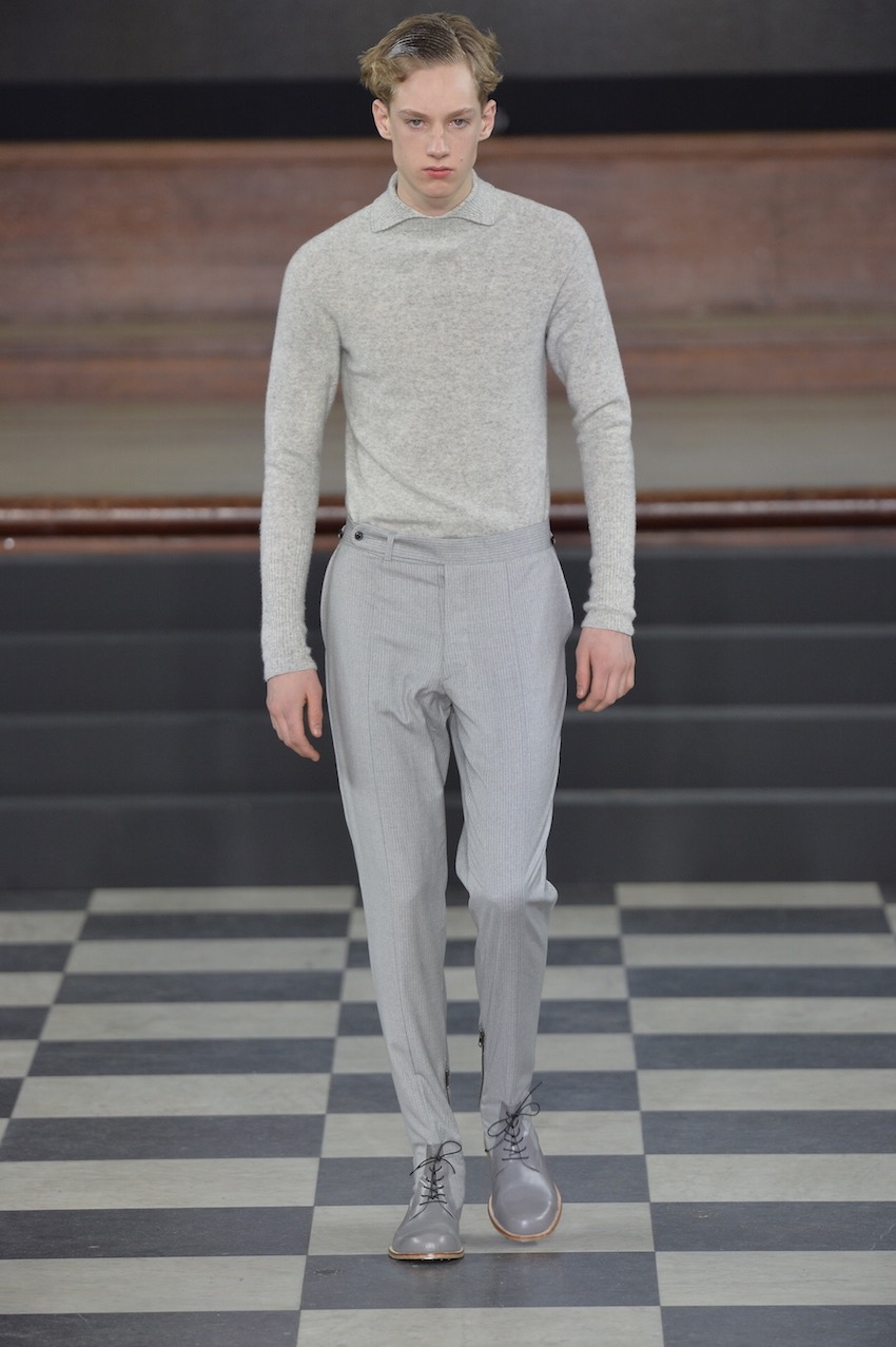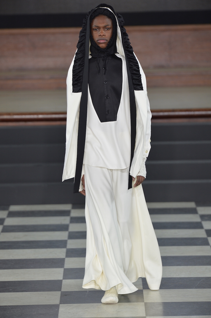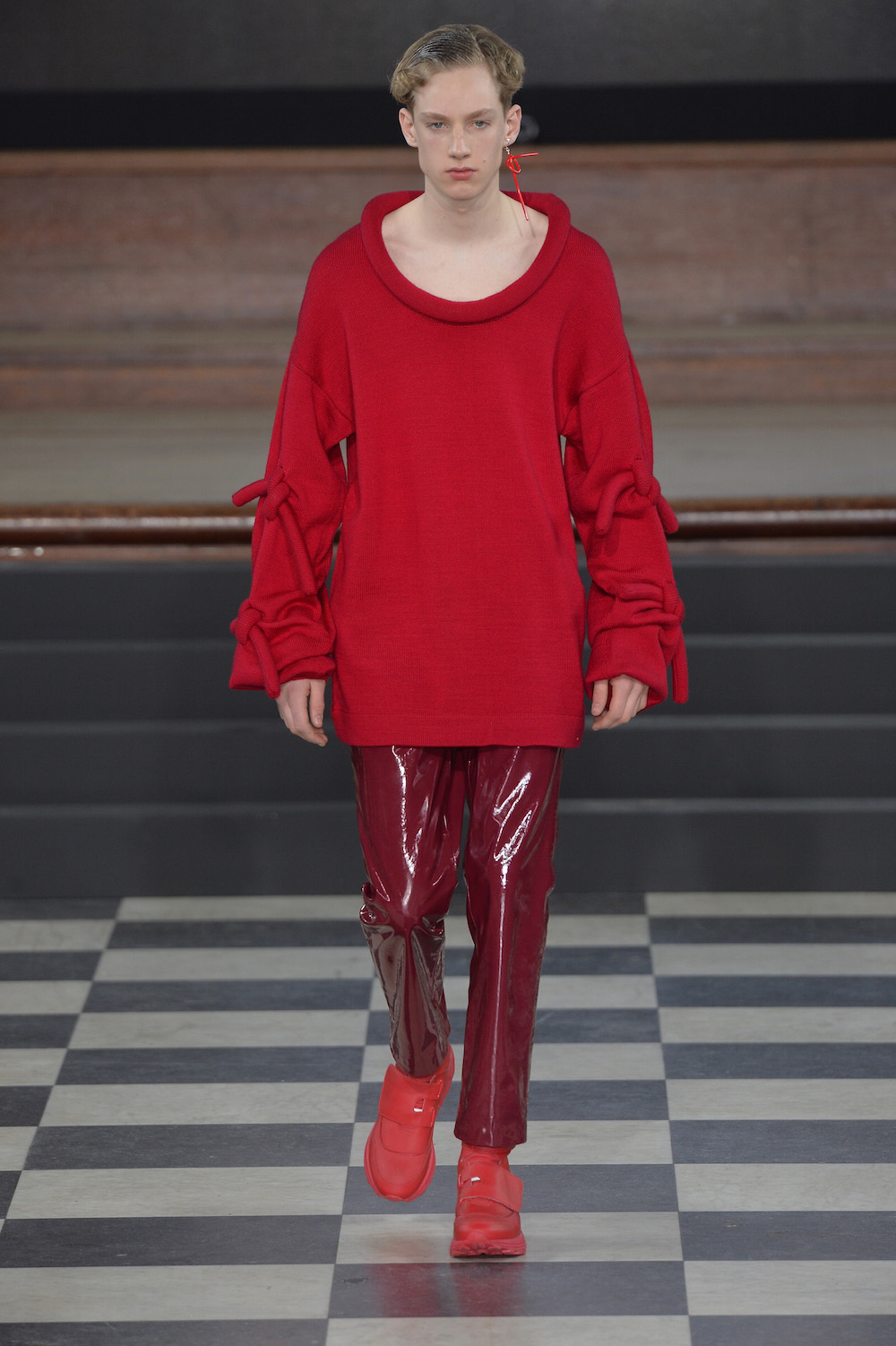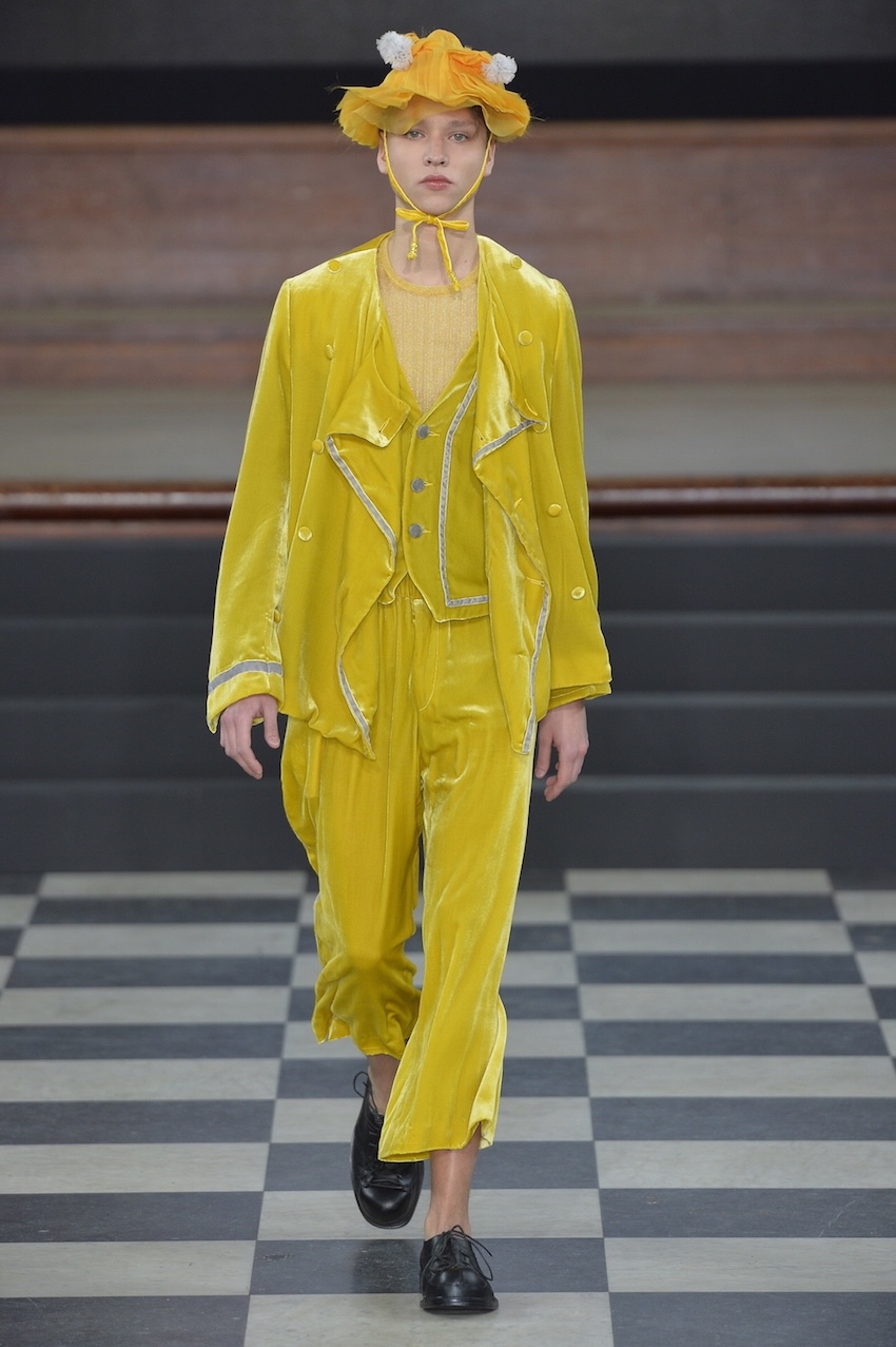 Soo Jin Cho said her collection was “based on French Literature, during the period of romanticism – it represents methods of synesthesia in literature. The collection is a translation of art history, into commercial fashion.” Soo focused on how the axis of tailoring changed from the shoulder to the head, concealing the classical male form, revealing and focusing on the male face. Read our full interview here.
