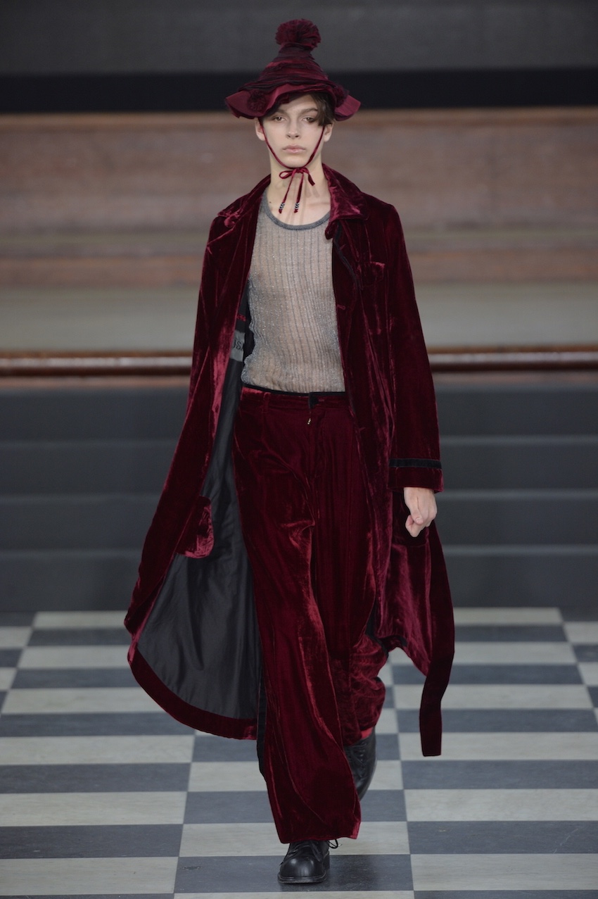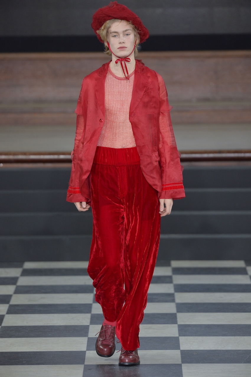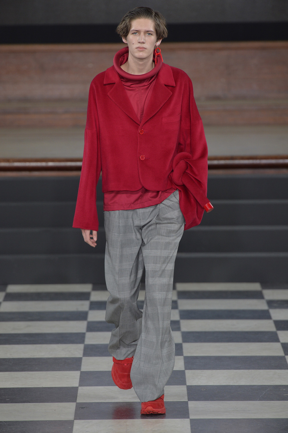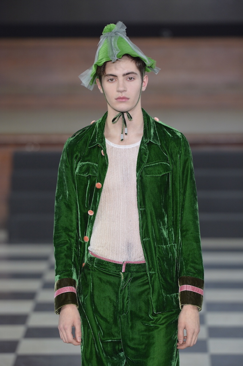 Next out on the catwalk was graduate Wentao Shi. Men are drawn and brought to life in his collection through layers of transparency that form opacity replicating the shadows of their bodies. He said, “The two main fabrics I used are velvet and organza. I laser cut the organza to express the different layers that can be formed in transparent fabric, and to make shadows. I chose these fabrics as a development from our first project. The velvet garments are more about the silhouette. I chose the colours green and red – red is the main colour in the collection.” Read the full interview here.