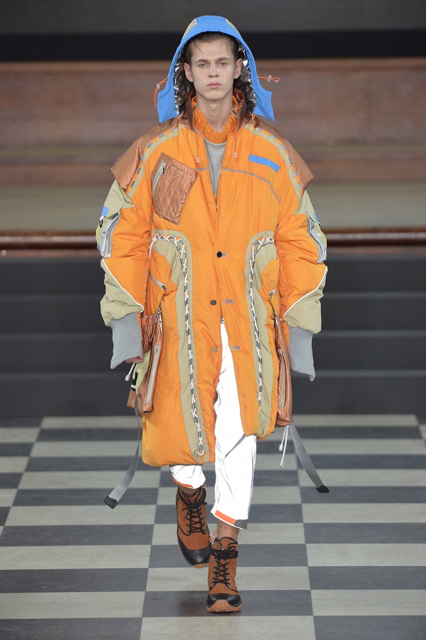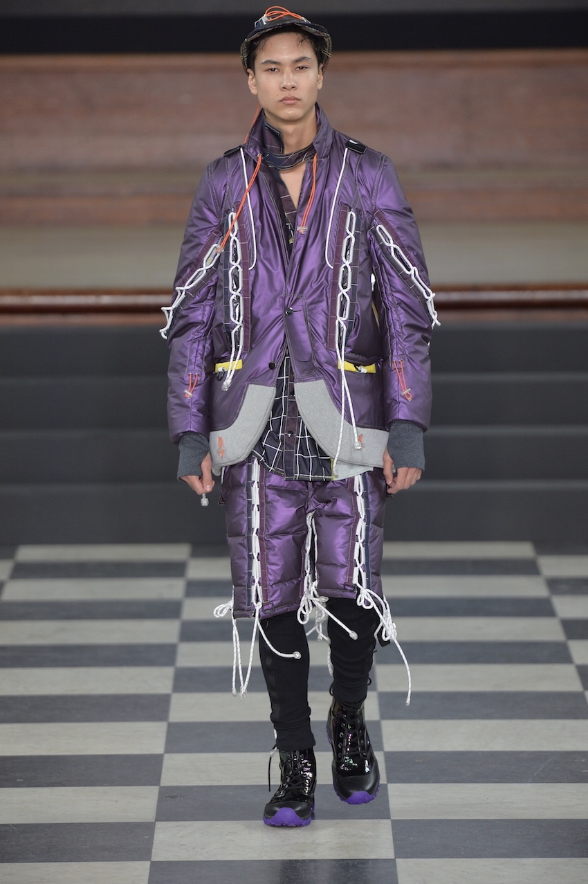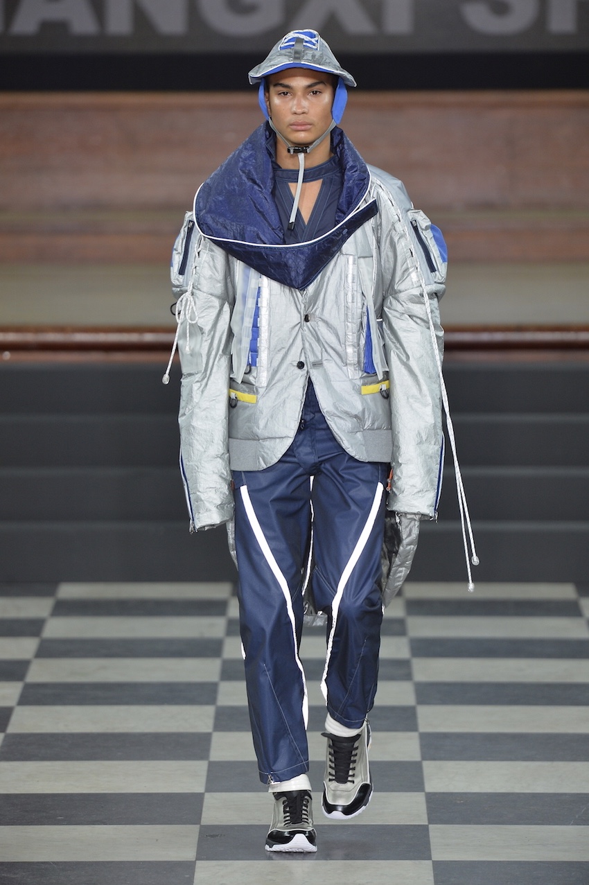 Changxi Shao called his collection Spaceman. He said “the idea came from different functioning garments in the industry. I mixed different garments together and tried to keep a balance, like garment structure between pattern cutting, and different functional details.” The space suit is often referred to as the ultimate protective workwear from injury. The use of adjustable seaming, filler and down detail highlights protection with comfort. Read our full interview here.