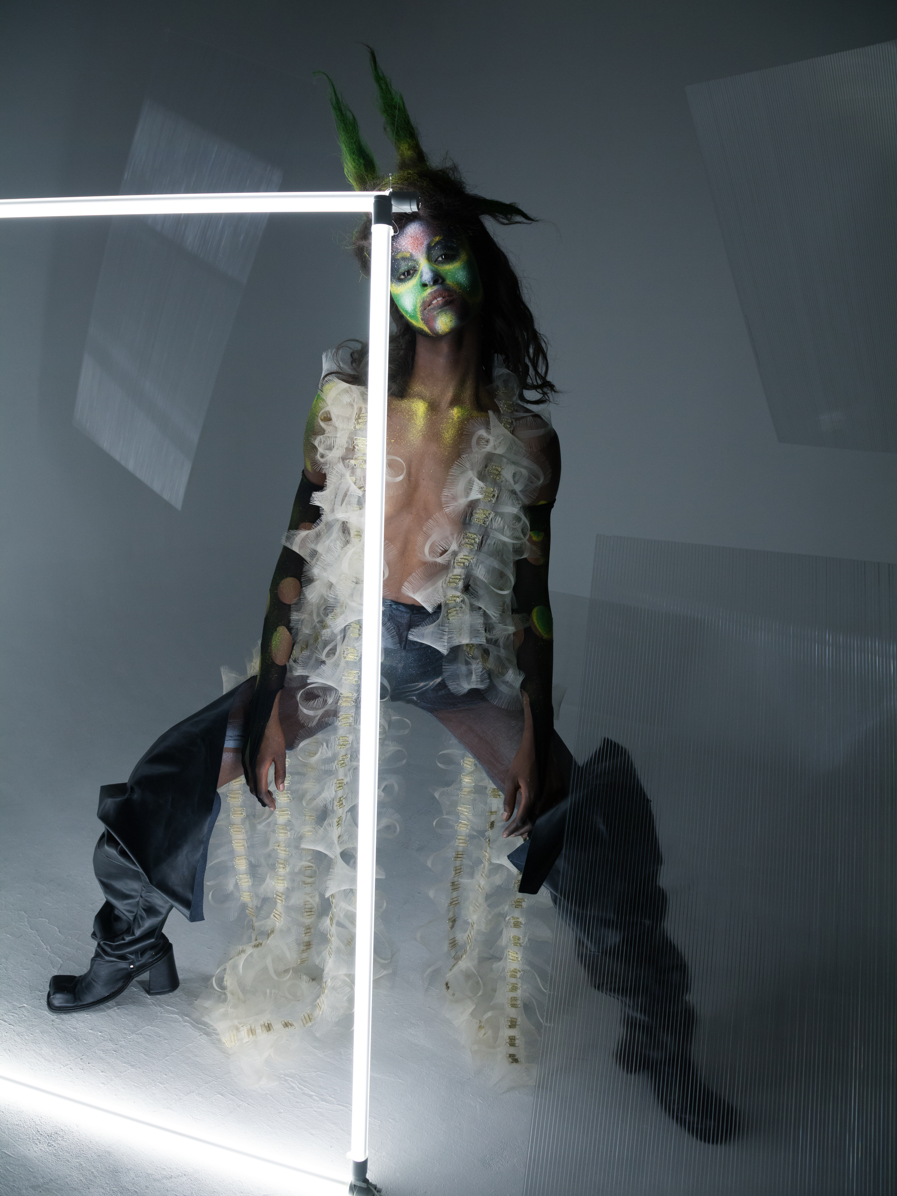 ‘Ecdysis’ explores the perception of beauty found in the toxic and scarred faces of the planet Earth and the complexity of its natural forms. I’ve prioritised sustainable elements in this collection, showcasing meticulous hand-craftsmanship and delicate hand-rendered pieces from slow fashion.