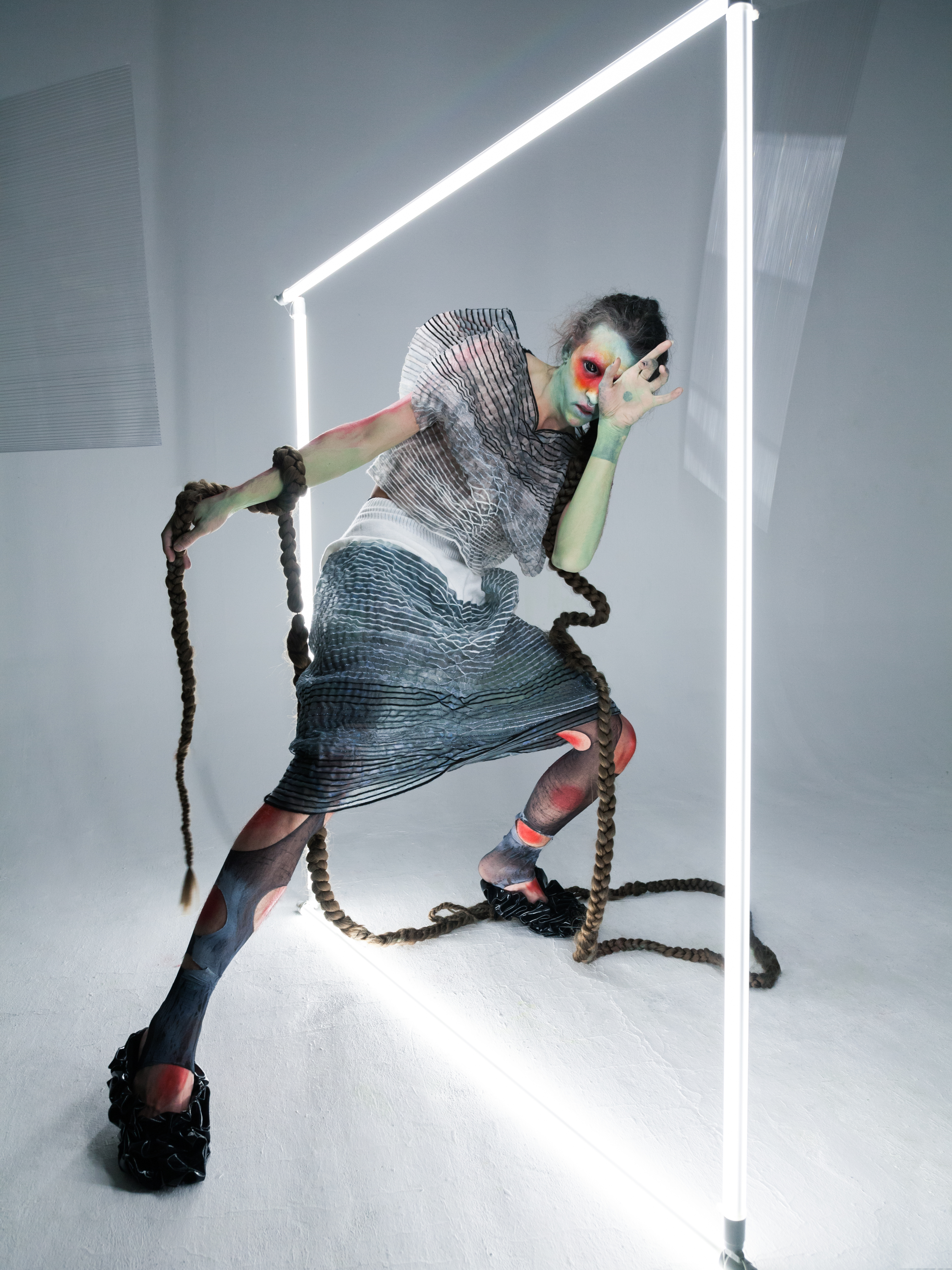 The collection aims to challenge traditional ways of knitting and establishes a new perception of how knitted textiles can be created through the combination of unconventional materials with yarns — I am really excited to see how knitted fabrics can adapt to the body in the future!