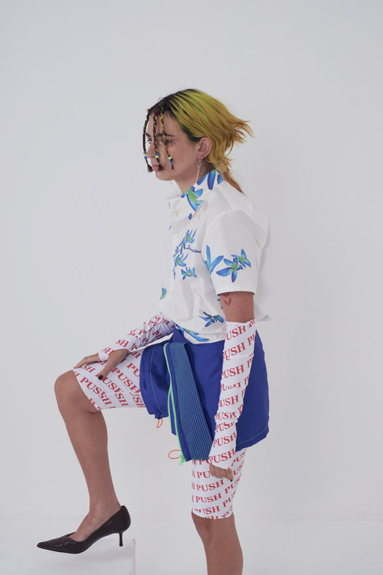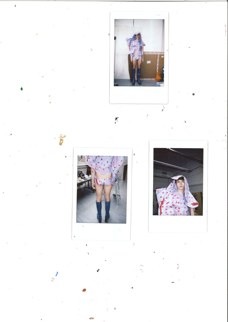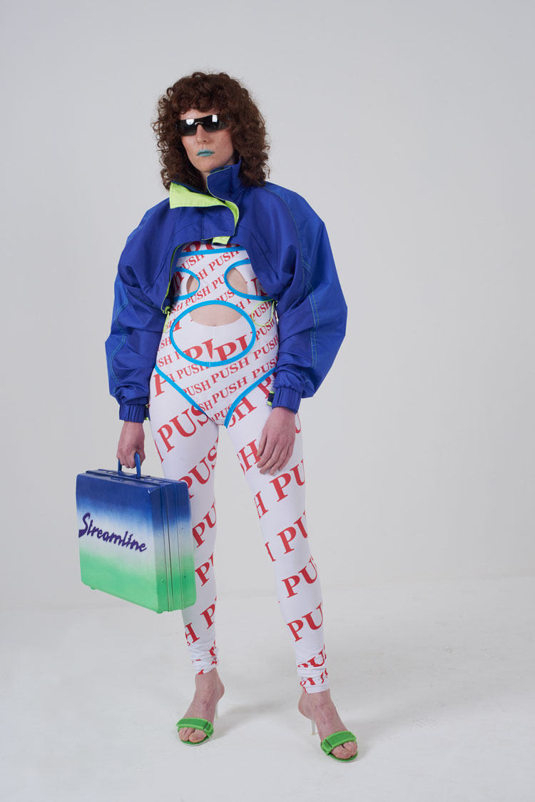 Jordan Charles studeid BA (Hons) Fashion Design and Development. Charlie’s final collection features repeating a shape to create a new one, the shape being duchaumps fountain. Each time he cut a new one he added a dart or a seam so it fit the body, and each stitch line creates curve and emphasises the body. The collection is a patchwork piece, mixing Jordan’s designs and concept with Marianna’s who studied Print Textiles. Bold colours and print pieces create a mish-mash of lines, strokes and silhouettes. “I wanted the collection to be fun, cheeky and not take itself too seriously, kind of like me” says Jordan. About his time at LCF he told us: “My first two years I was a terrible student, my course leader will vouch for me on that one, then after placement year I really started to develop as a designer and start finding my own aesthetic. As cliche as it sounds, I figured out why I wanted to study fashion, because its fun and you can make it entirely your own. LCF has been great as its got such variety of people and disciplines, my advice is to enjoy it and don’t take yourself too seriously. Final year has been the best, creative freedom and putting everything you’ve learned over the years into your final project is really exciting”.