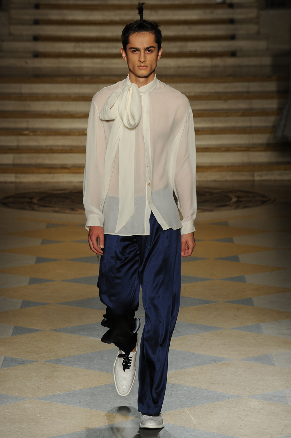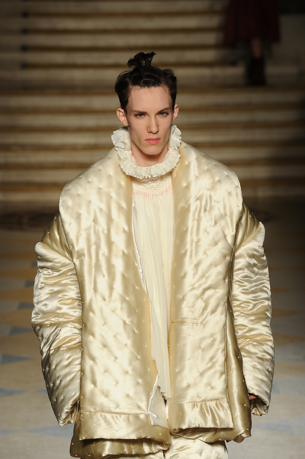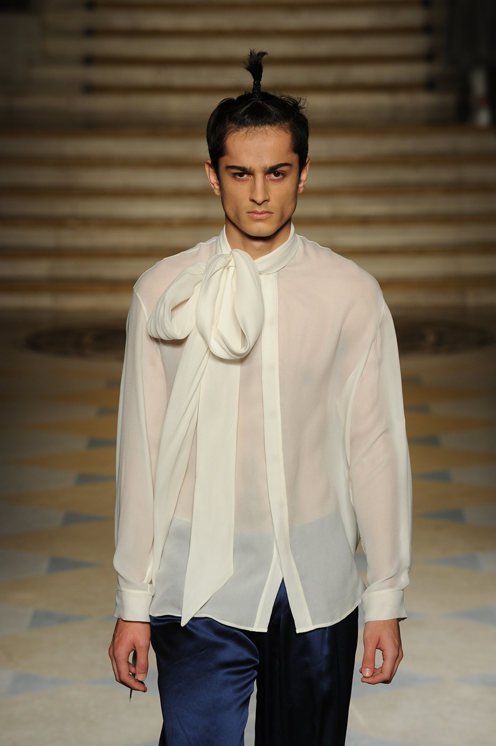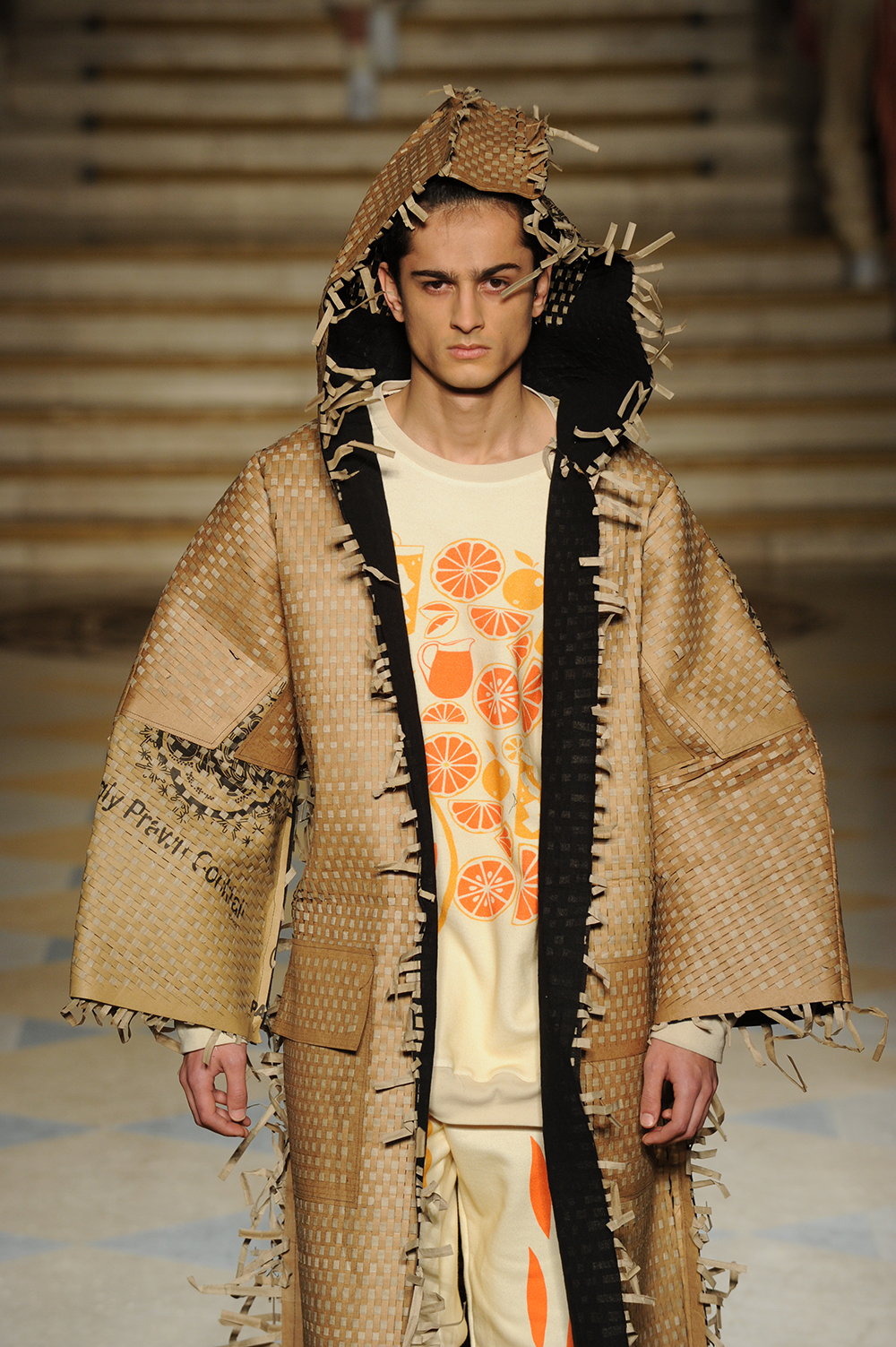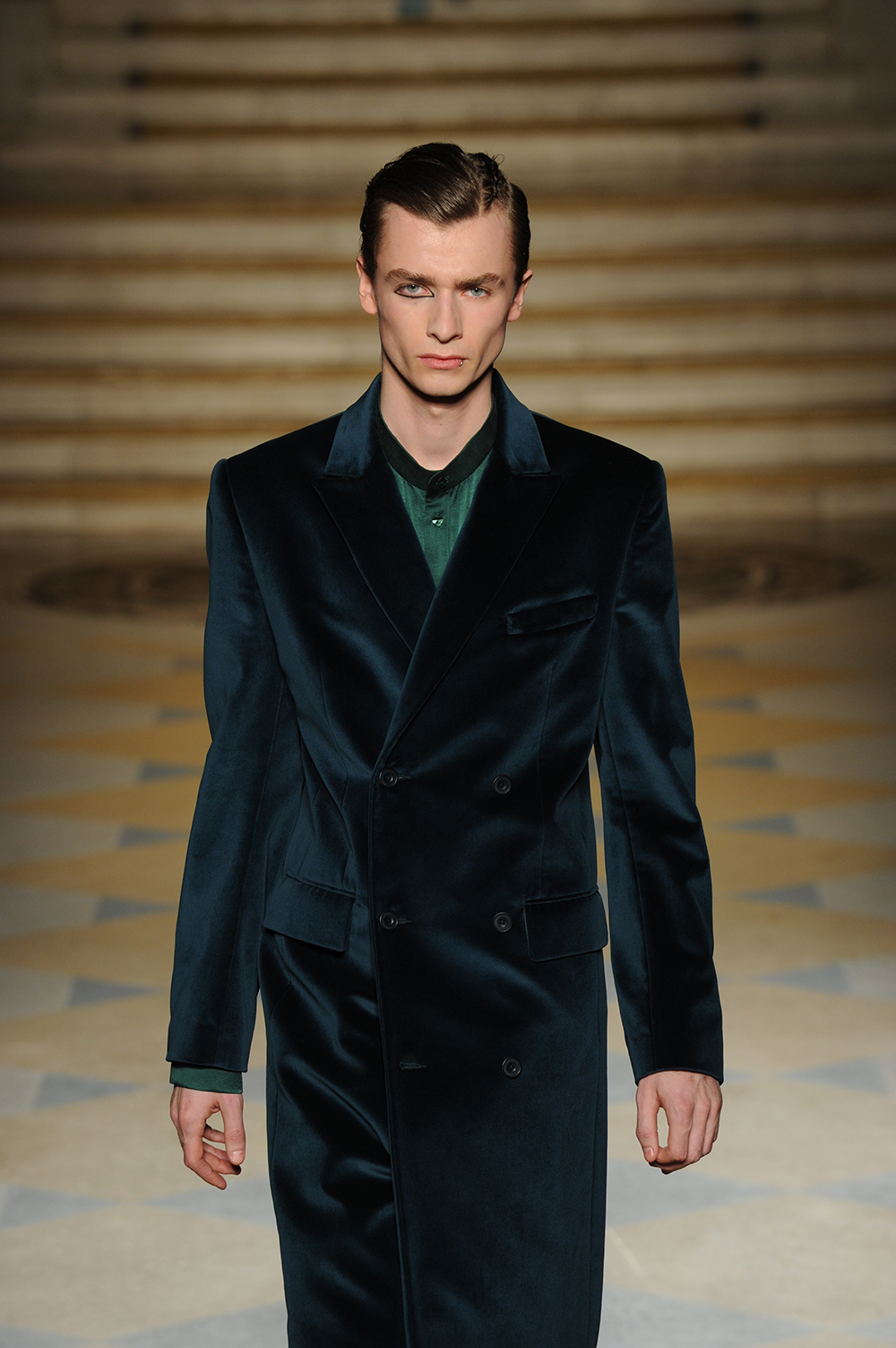 This year’s event, held in the City’s Banking Hall, was the second LCF MA Menswear catwalk show. 10 student designers showed their collections, with inspirations coming from far and wide, Jeuken Cho referenced depression and Robin Williams, Alexis Housden explored veils after a relationship break up, while Bethany Williams wanted to talk about political change through her favourite philosopher Jacques Rancière.