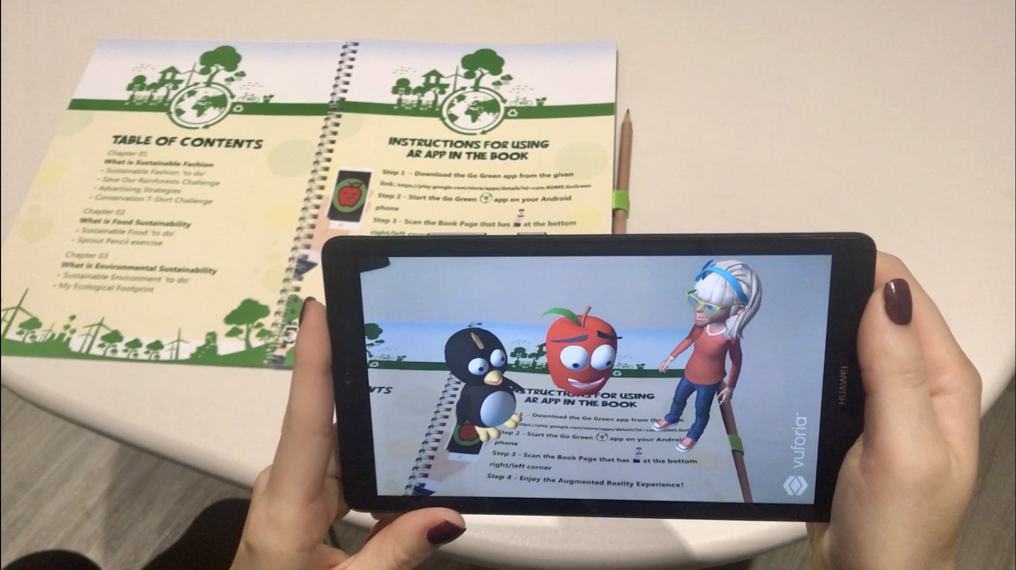 Go Green is an augmented reality book for children about fashion sustainability, food sustainability and environmental sustainability. As well as being informative, I wanted to make this book interesting and fun, which is why I decided to use AR technology that allows children to be guided throughout the book by different characters.