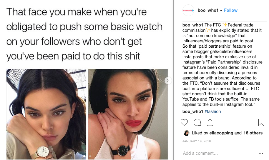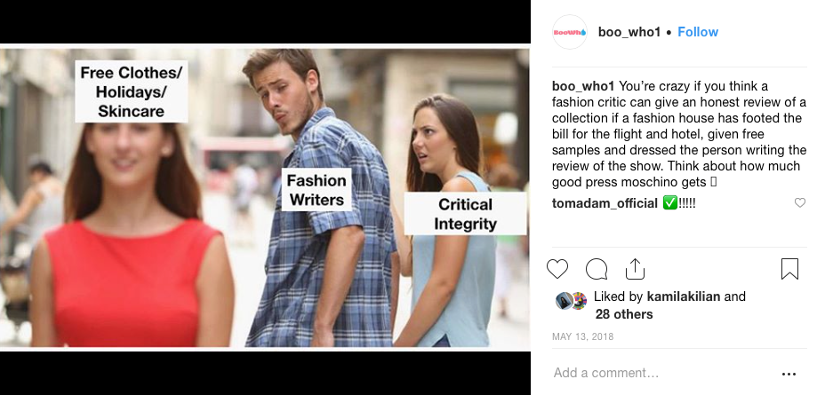 Through posting Memes on the anonymous Instagram account Boo Who, the aim of my Masters project was to explore whether or not digital satire can be used as a critique of non-transparent practices between fashion brands and advertisers.