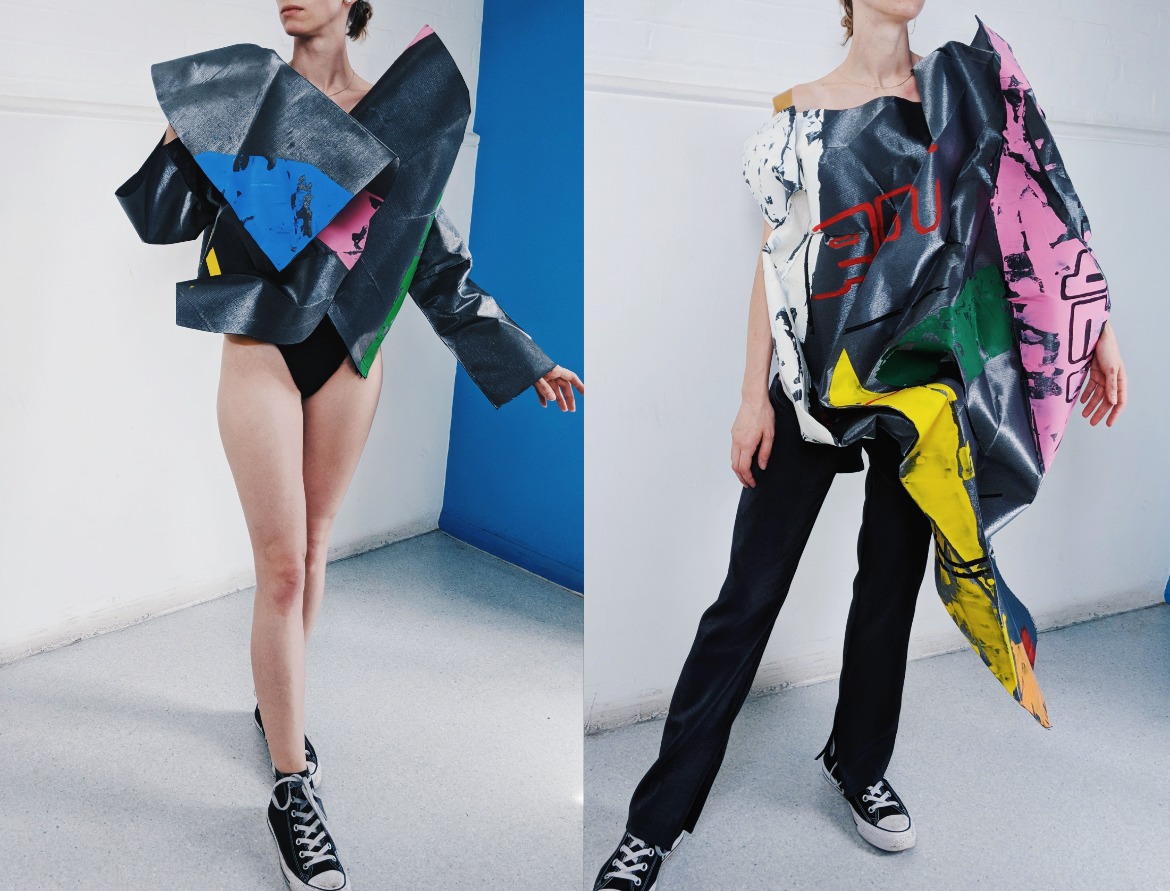 At the time I really wanted to do something avant-garde as I thought that would be best to get into an MA. My final project was very structural and bizarre, I don't think it really reflects me as a designer anymore, but it was a fun exercise to meld together some sculptural and artistic references. I was looking at a sculptor, John Chamberlain, and fusing that with really ‘tacky’ references. I'm from a working-class background so a lot of my work references that in some way. The project included elements of NASCAR, which is a working-class interest or hobby, put together with art which is kind of an upper-class interest I guess you could say. So it was melding those two together in a weird, very structural garment that I then painted with latex to get this chipping effect that you would have on a crashed car.